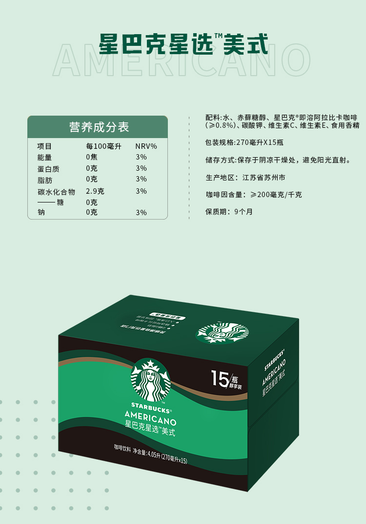 商品名称:Starbucks/星巴克星选美式270ml*15瓶无糖即饮咖啡代餐优选 包邮