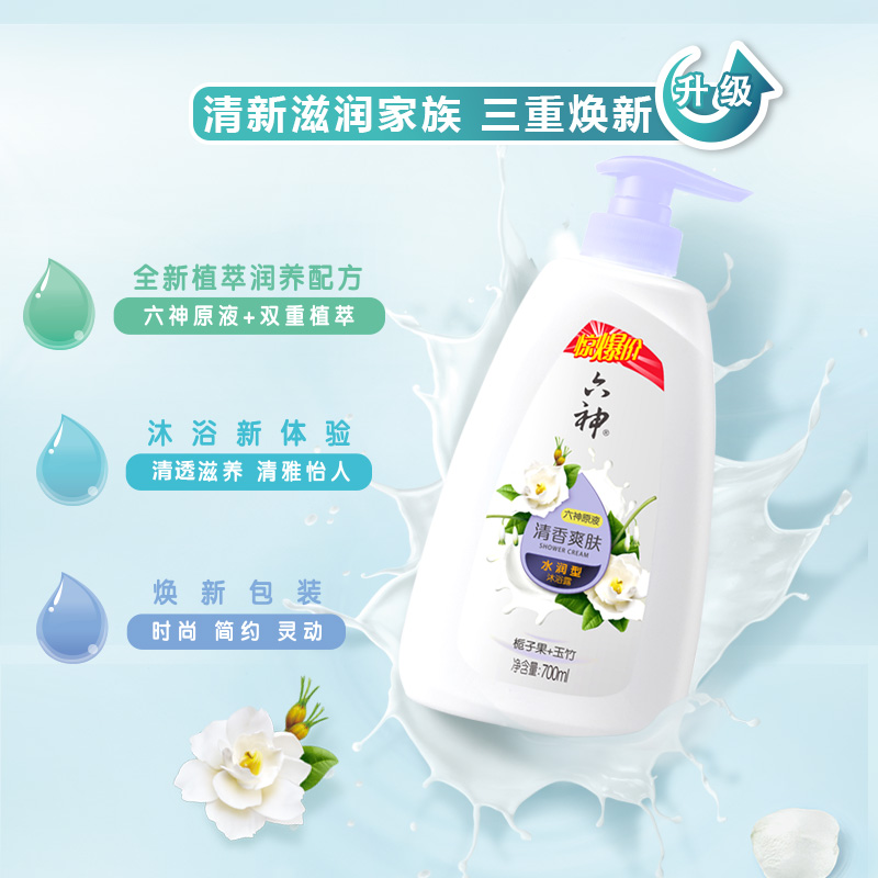商品名称:六神清香爽肤栀子花香滋润嫩肤易冲洗保湿沐浴露700ml