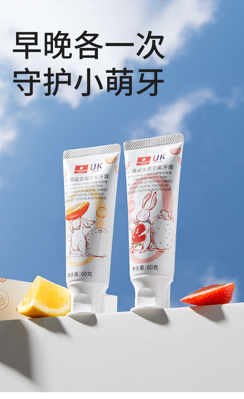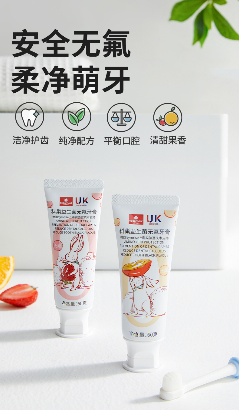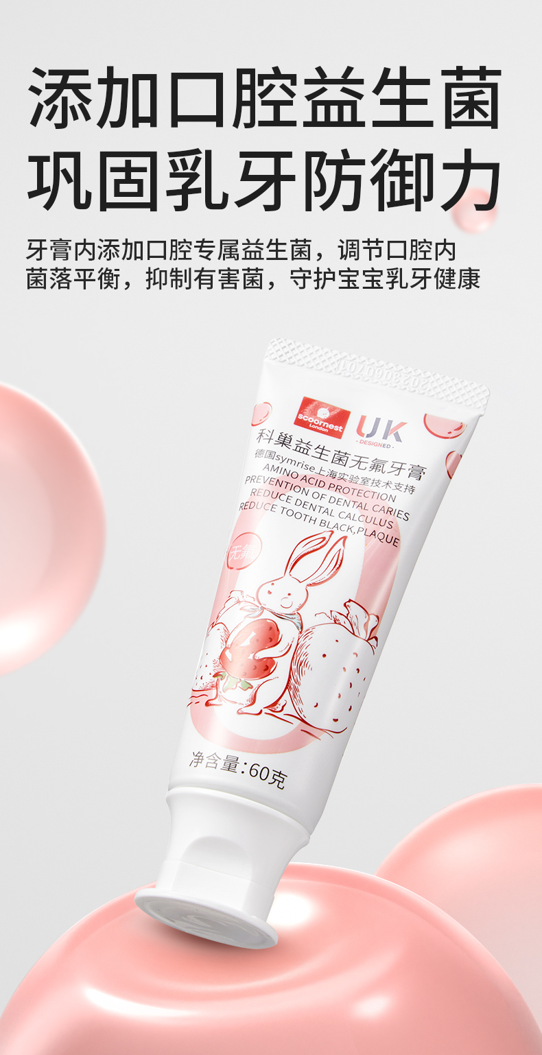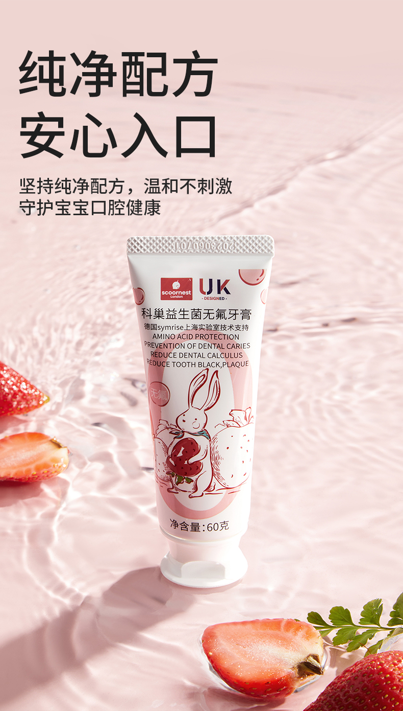 商品简介:安全无氟,柔净萌牙;纯净配方,安心入口;安全无害不含氟,宝宝误吞也不怕;德国symrise实验室联合研发;添加口腔益生菌,巩固乳牙防御力;温和低泡无残留,深入口腔不干呕;清甜果香好口感,自主刷牙不抗拒;早晚各一次,守护小萌牙。