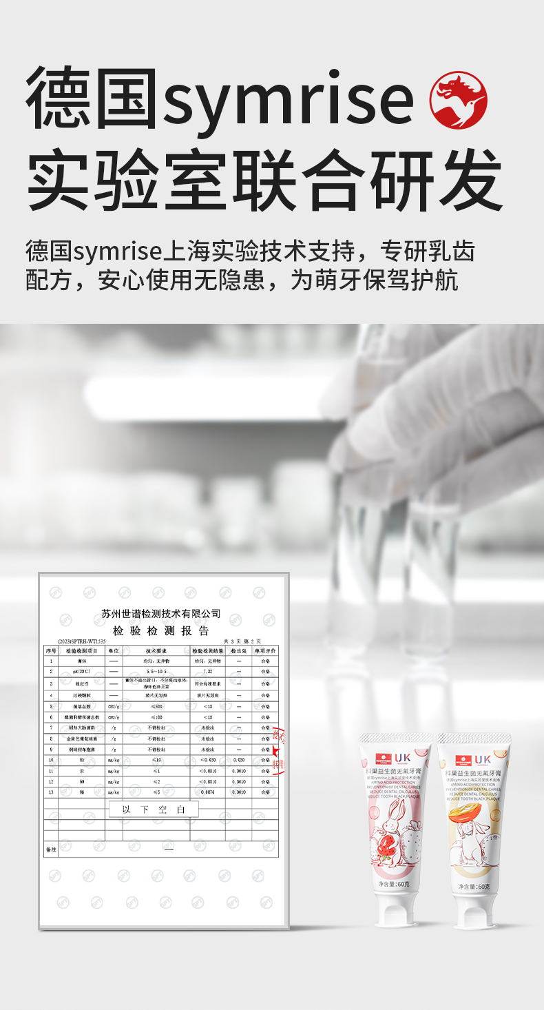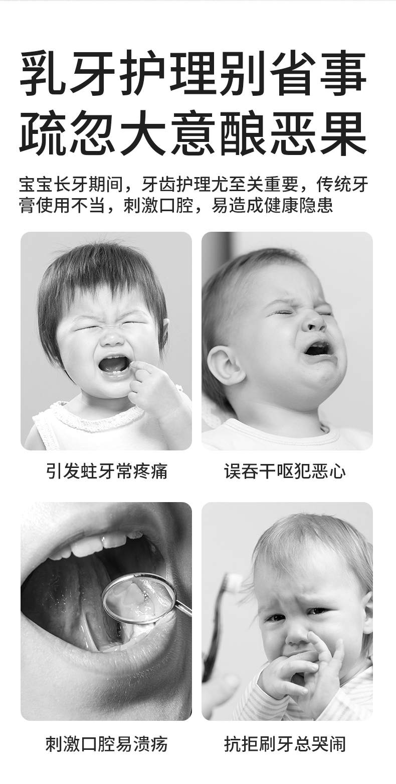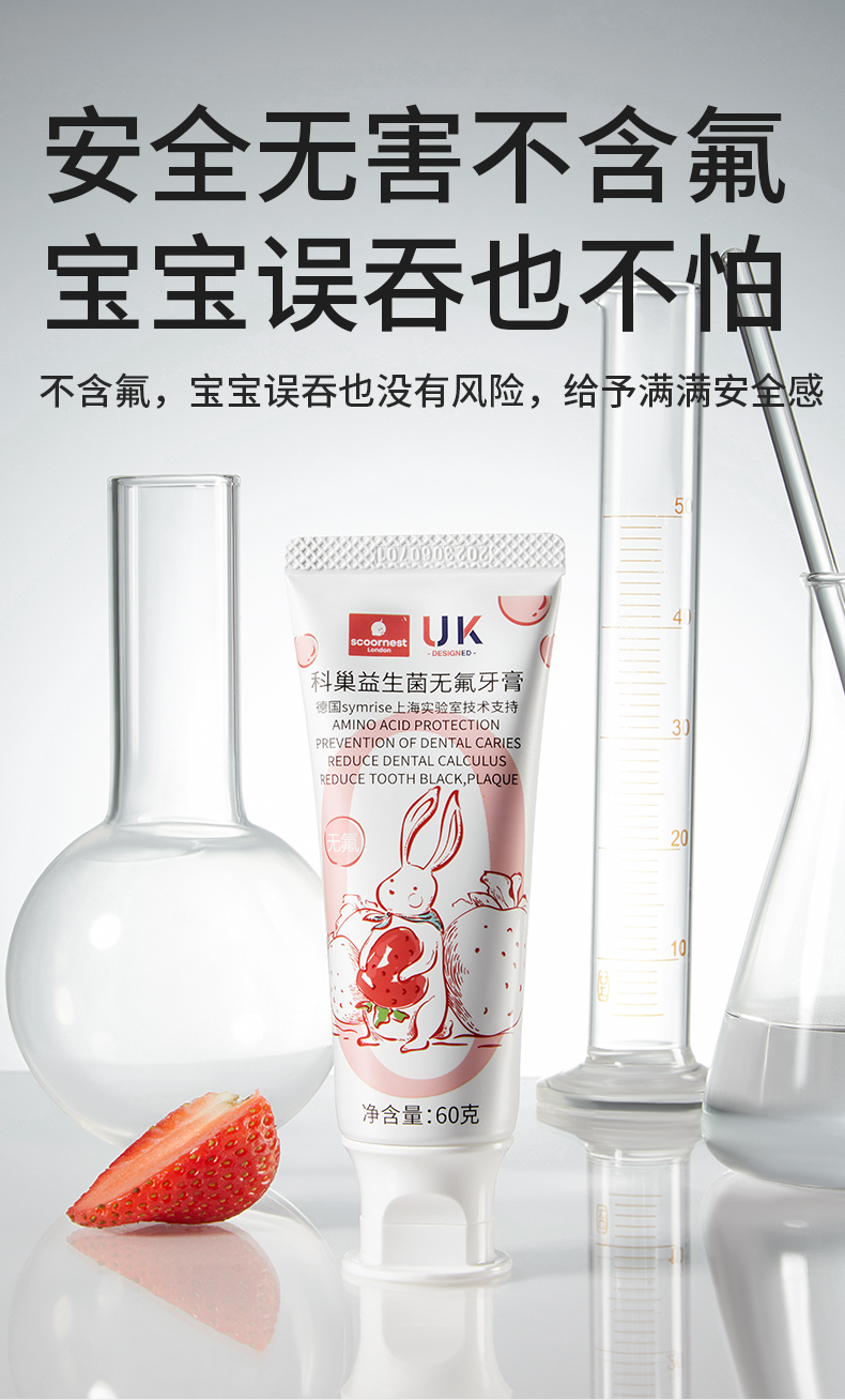 商品简介:安全无氟,柔净萌牙;纯净配方,安心入口;安全无害不含氟,宝宝误吞也不怕;德国symrise实验室联合研发;添加口腔益生菌,巩固乳牙防御力;温和低泡无残留,深入口腔不干呕;清甜果香好口感,自主刷牙不抗拒;早晚各一次,守护小萌牙。