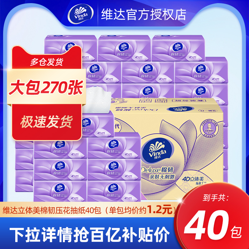 商品名称:[百亿价46.9元40包]维达纸巾40包面巾棉韧抽纸大包餐巾纸抽实惠装