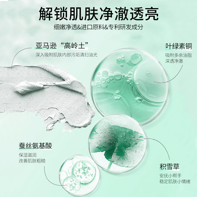 商品简介:大部分肌肤问题源自清洁不当,韩瑟叶绿素氨基酸细嫩洁面泥吸附毛孔中的污垢及多余油脂,深透净澈,无刺激感不伤肤,易敏肌肤也可放心使用。
