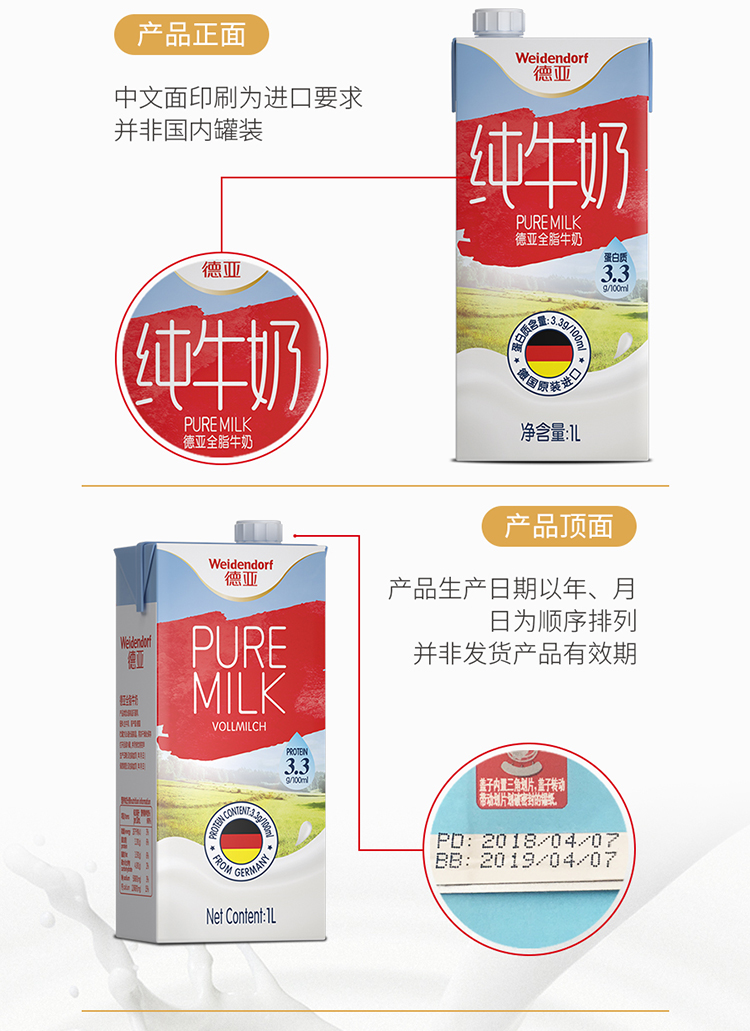 商品介绍:【进口】德国牛奶德亚全脂牛奶高钙1L*6盒
