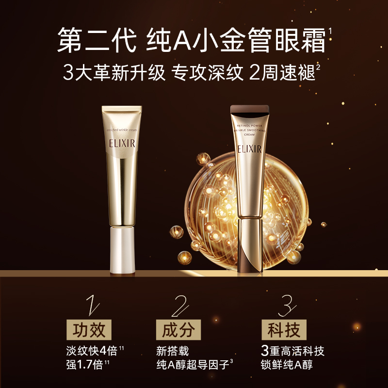 商品简介:【Elixir/怡丽丝尔】2周淡细纹,9周抚深纹,由内充盈,向外抚纹,采用高浓度油分包裹,减少纯粹视黄醇1与外界接触,加强活性,舒适肤感~