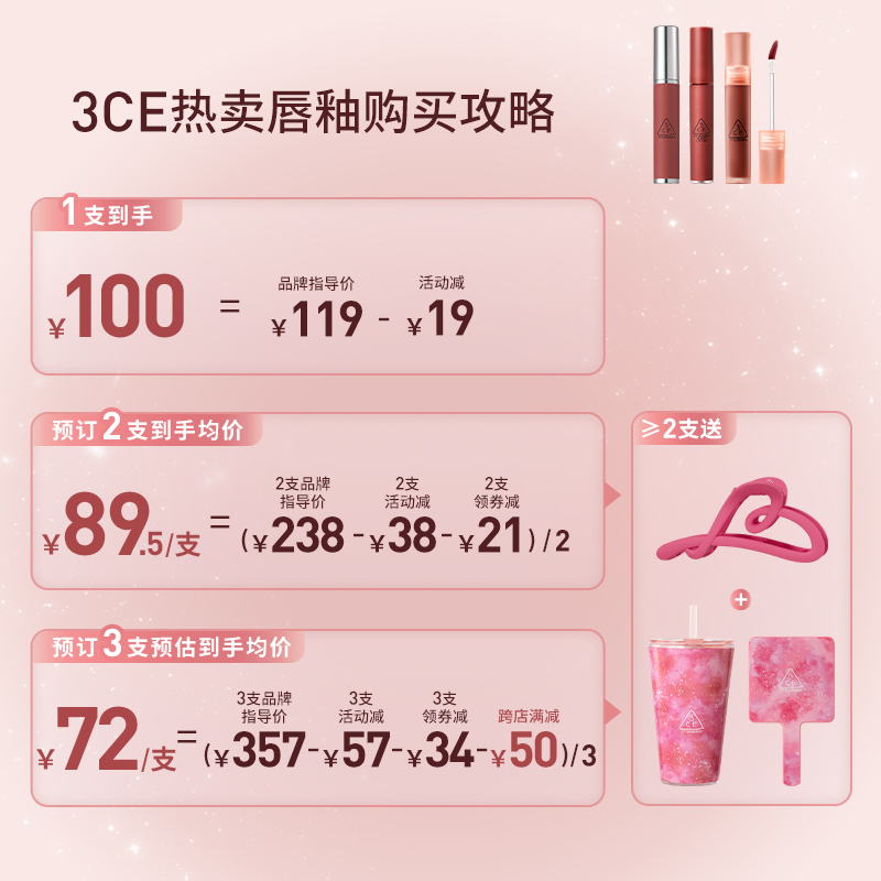 商品介绍:【拍2件】3CE丝绒唇釉2支