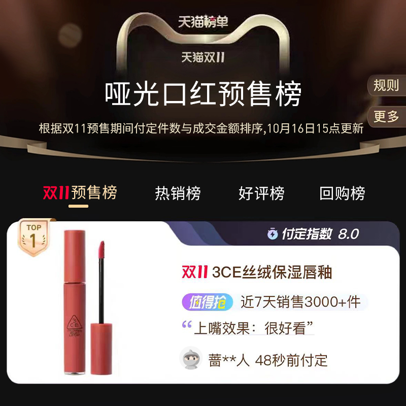 商品名称:【双11加购】3CE丝绒唇釉 雾面哑光口红梨色豆沙红砖红唇泥唇彩 T
