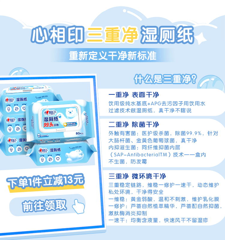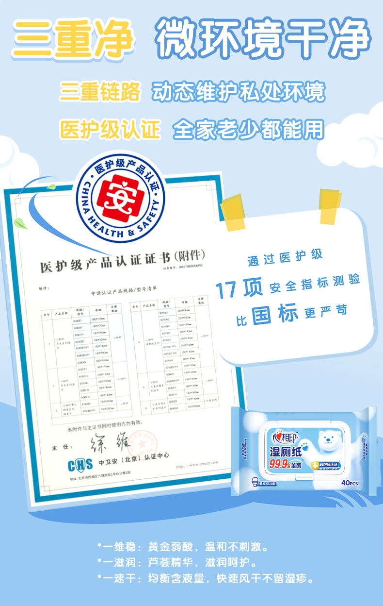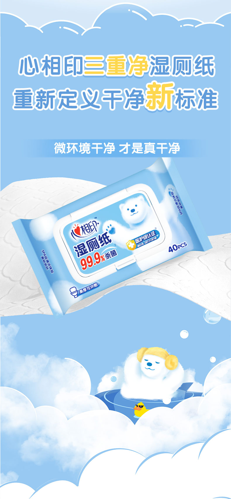 一抹洁净,击败细菌,擦走细菌,屁屁更安心,厚度升级18%,颠覆传统清洁理念,从未有过的舒爽,温和不刺激,清洁抑菌宝宝也能用哦!
