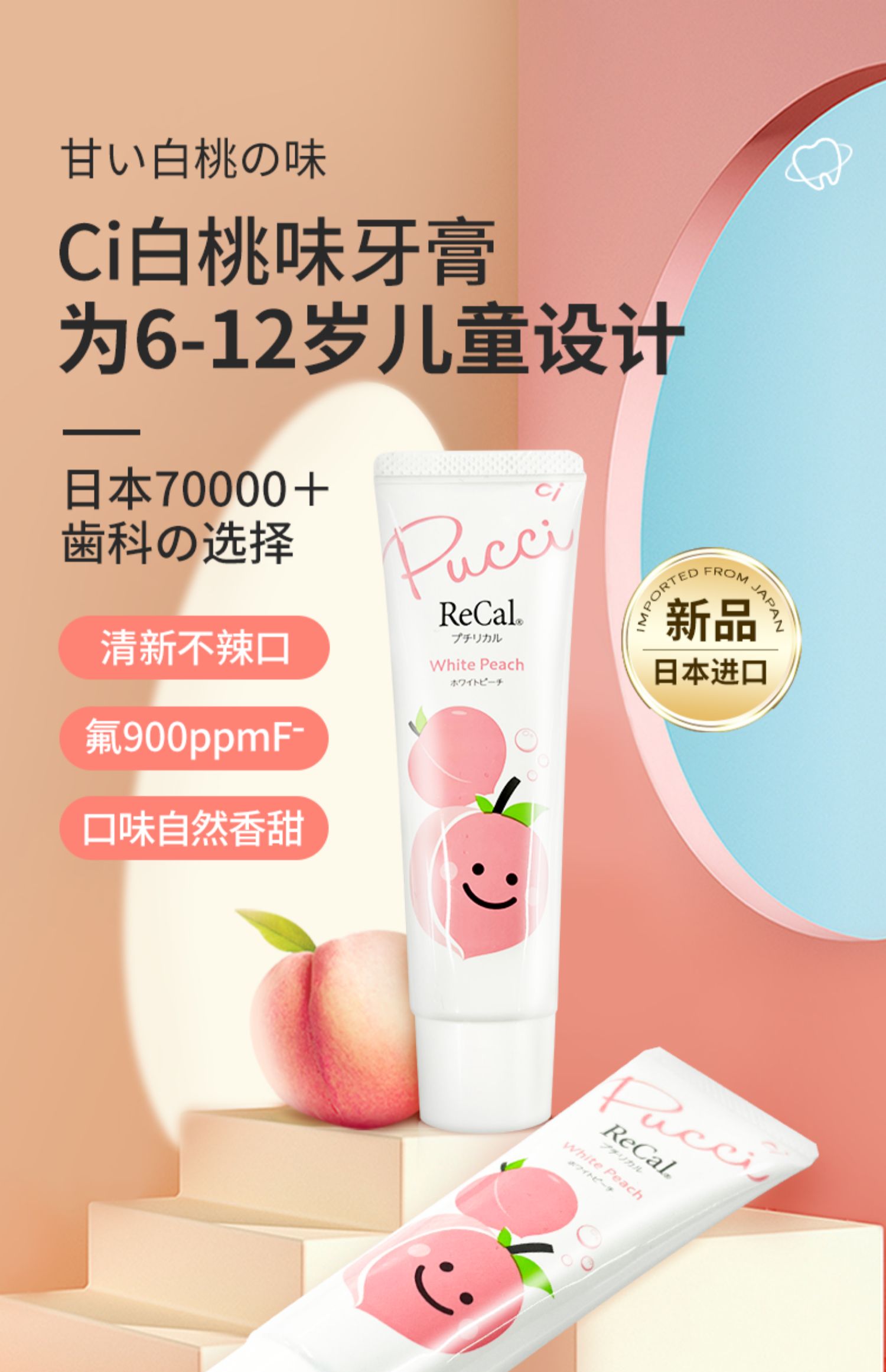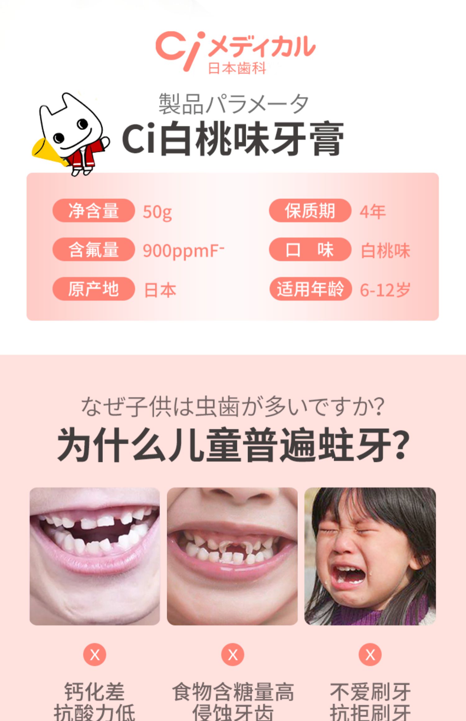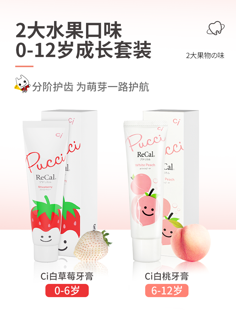 商品名称:日本进口ci儿童牙膏水果白桃味0-6岁/6-12岁宝宝防蛀含氟防龋齿