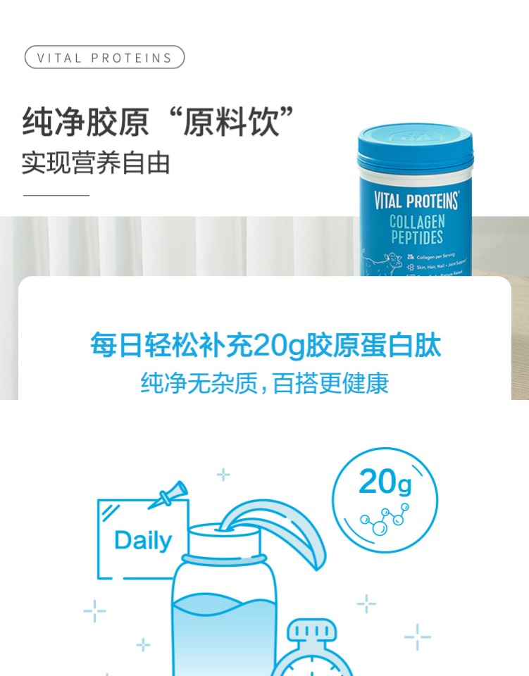 商品简介:【300减50;全店前100名付定赠20元猫超卡,抢付定金2件赠20元猫超卡+VP收纳箱;全店前300名抢付尾款1件赠 VP定制勺子】VitalProteins大蓝罐蛋白肽粉,这款胶原蛋白肽粉,采用小分子科技,极易被人体吸收,为你的肌肤打开一道美丽的通道。它含有丰富的胶原蛋白,能够深入肌肤底层,滋养并紧致肌肤,让你的肌肤重现年轻光彩!