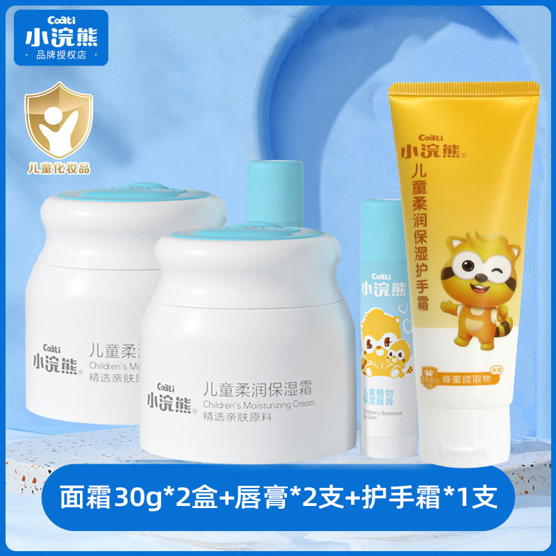 商品介绍:到手5件小浣熊儿童面霜2瓶+唇膏+护手霜