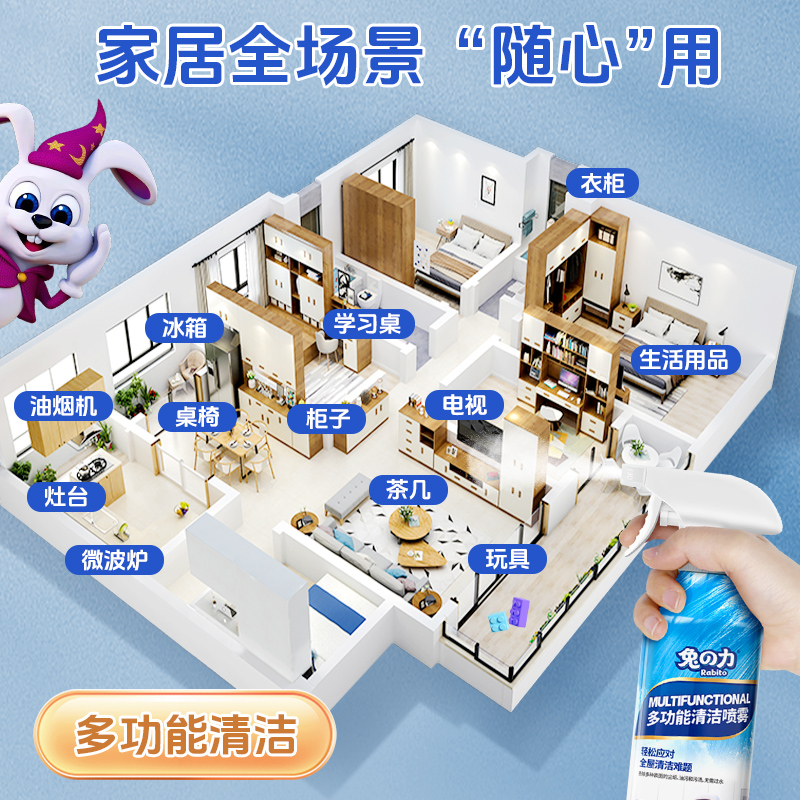 商品简介:【双11预售专享】兔力家居清洁套装,多功能清洁喷雾500g+厨房油污净500g+栀子花香洁厕液600g+地板清洁片30片+蓝泡泡50g*5