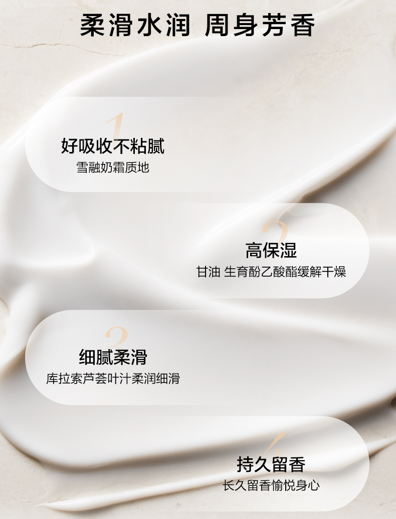 商品简介:【到手250ml,买赠价值¥158身体乳,加上赠品折扣率6.1折】雪融奶霜质地!好吸收不粘腻,含高保湿成分甘油生育酚乙酸酷缓和干燥!库拉索芦荟叶汁柔润细滑,留香持久,细腻丝滑!