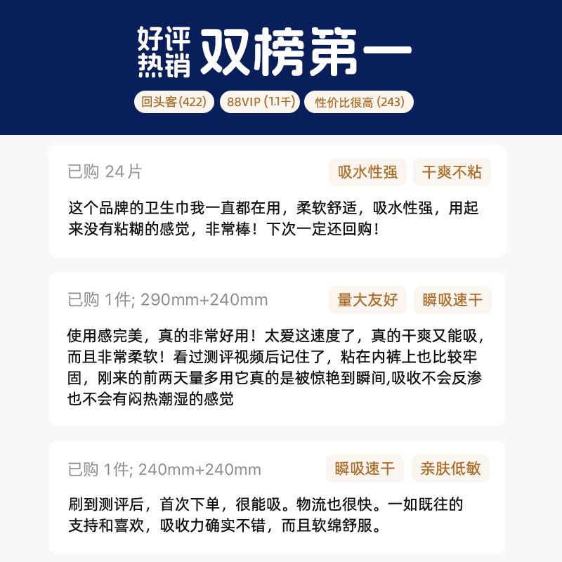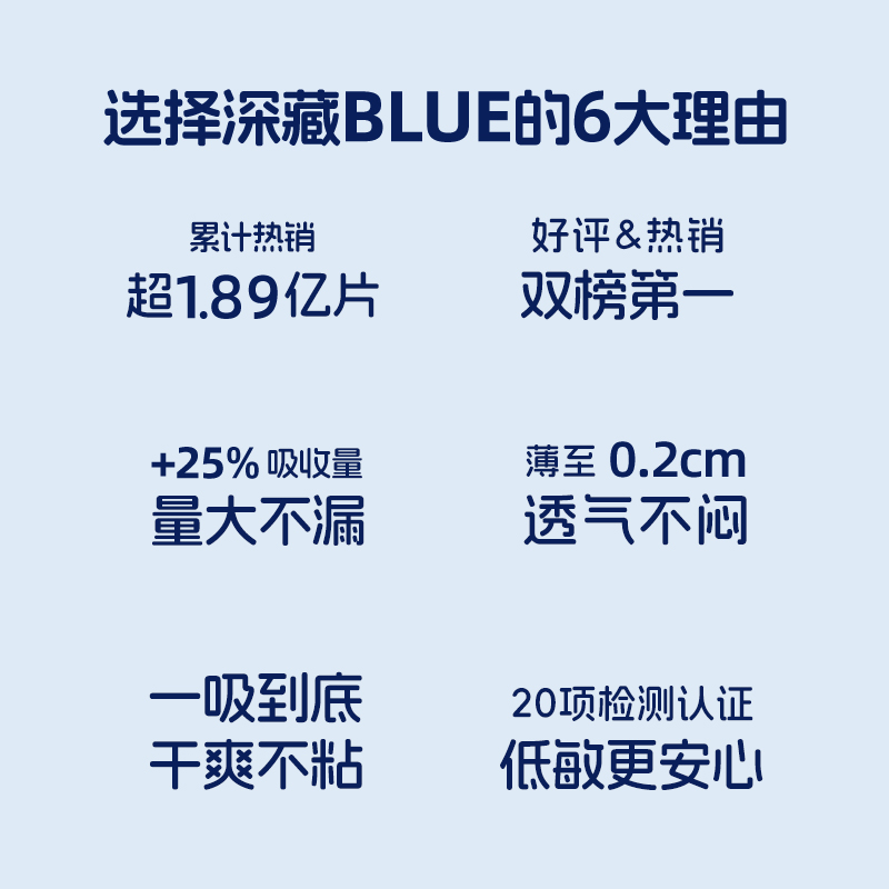 商品简介:经血一吸到底,表面干爽不漏,夏天告别闷气粘腻。量大星人无惧侧漏。她研社深藏blue卫生巾24片,集美快冲!
