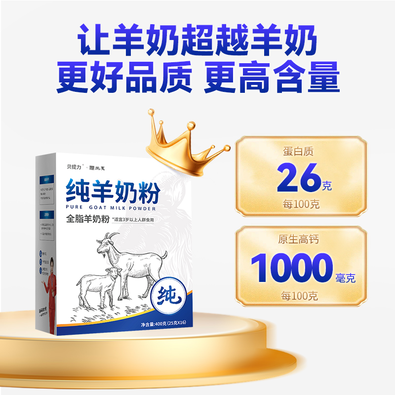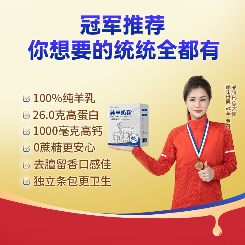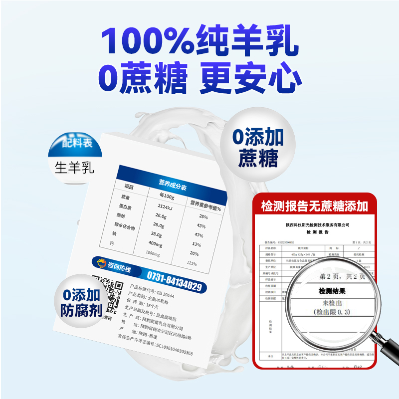 商品简介:【0元免费试喝,回购正装全额退】,全脂纯羊奶粉,配料表只有生羊乳,好吸收不过敏,改善食欲,提高免疫力,营养全面!适合学生中老年人~