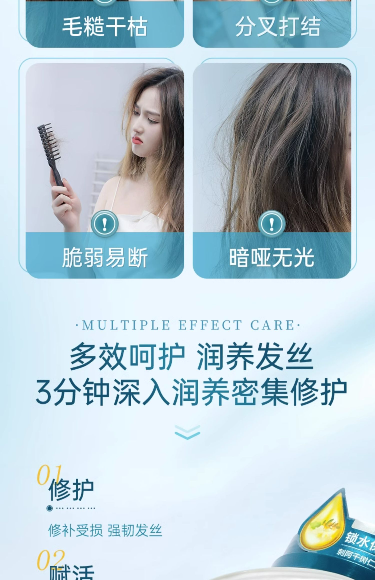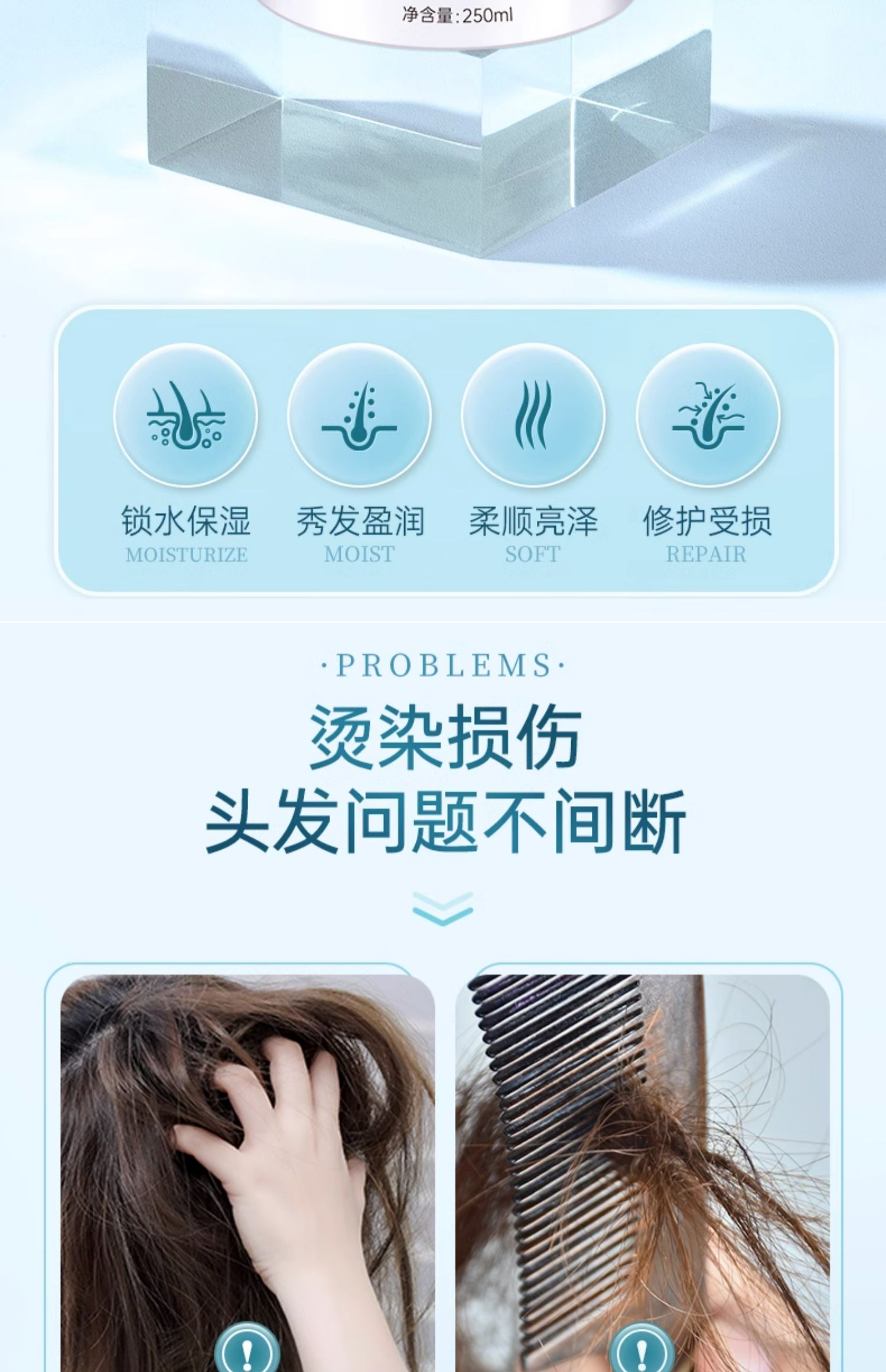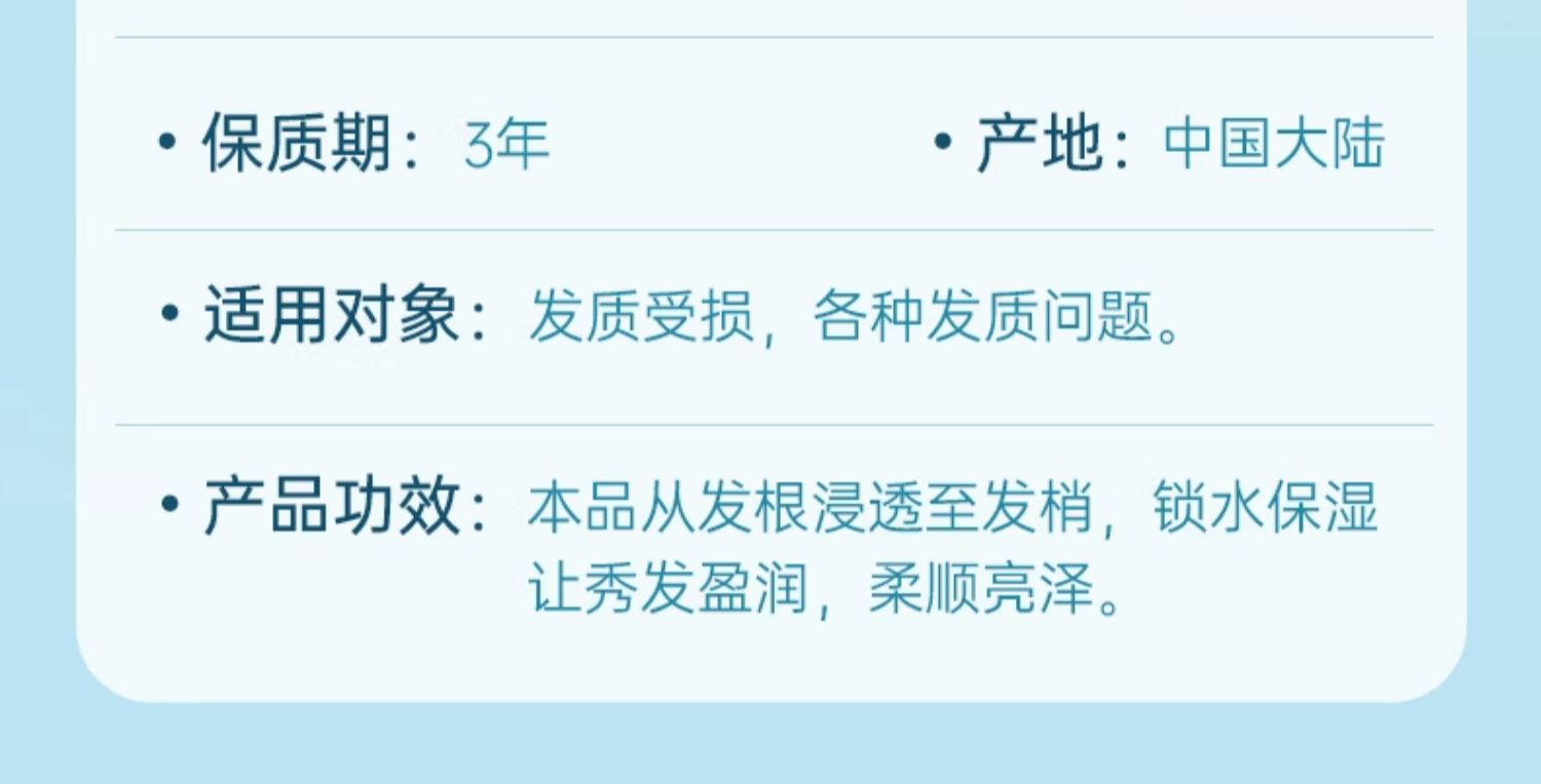 商品简介:【卓蓝雅旗舰店】核心修护,无惧秀发损伤,润泽顺滑,一梳到底,锁水保湿秀发莹润,柔顺亮泽修护受损,多效呵护,3分钟深入润养密集修护,5重协同作用,深层渗透。