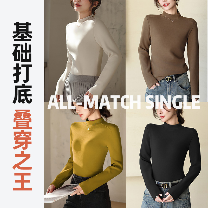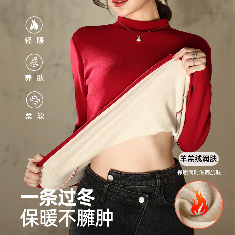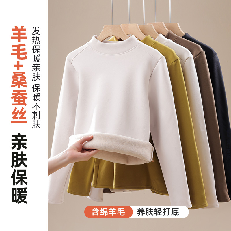 商品简介:羊毛蚕丝打底衫女秋冬加绒加厚内搭,德绒中领外穿修身保暖长袖上衣