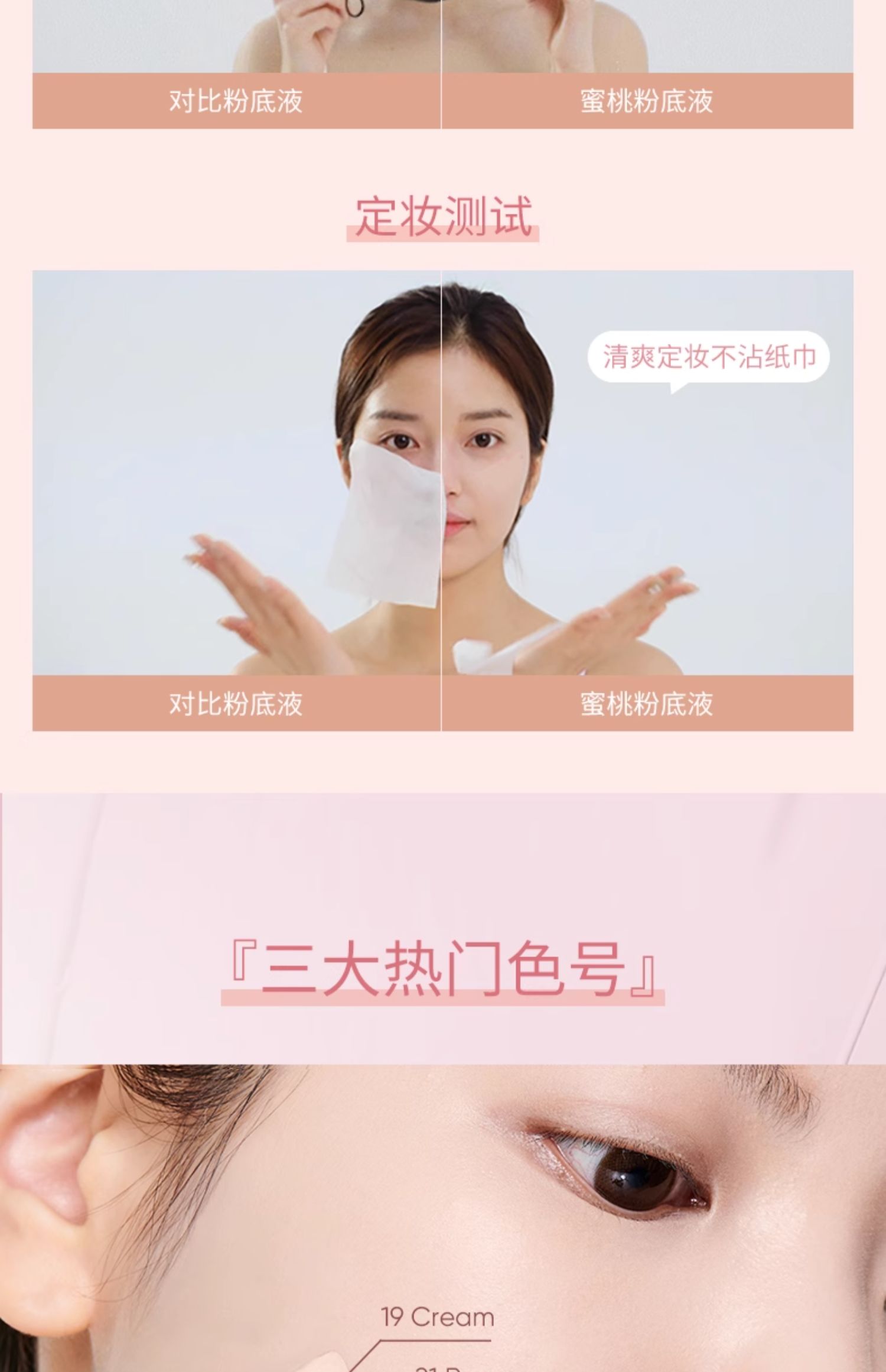 商品简介:【买就送粉底刷或者小蛋糕粉扑】自带蜜桃甜香,妆容如水蜜桃般绒感十足又清透自然,超赞~
