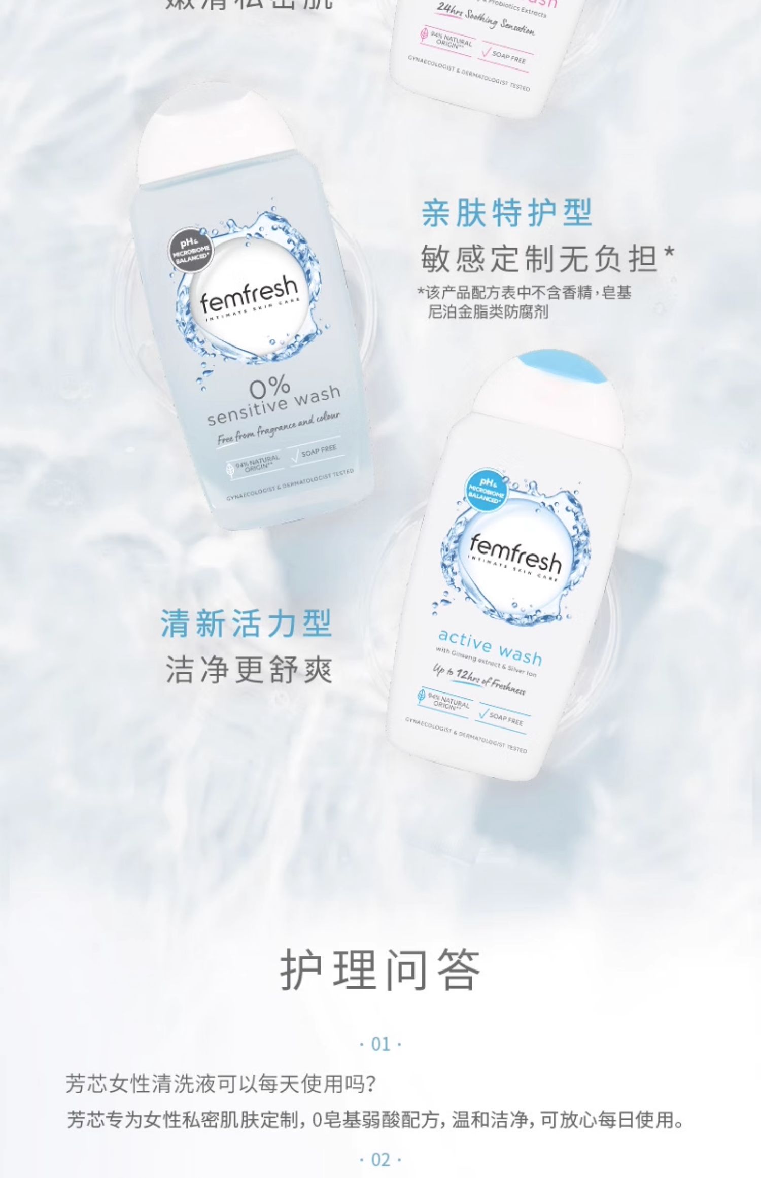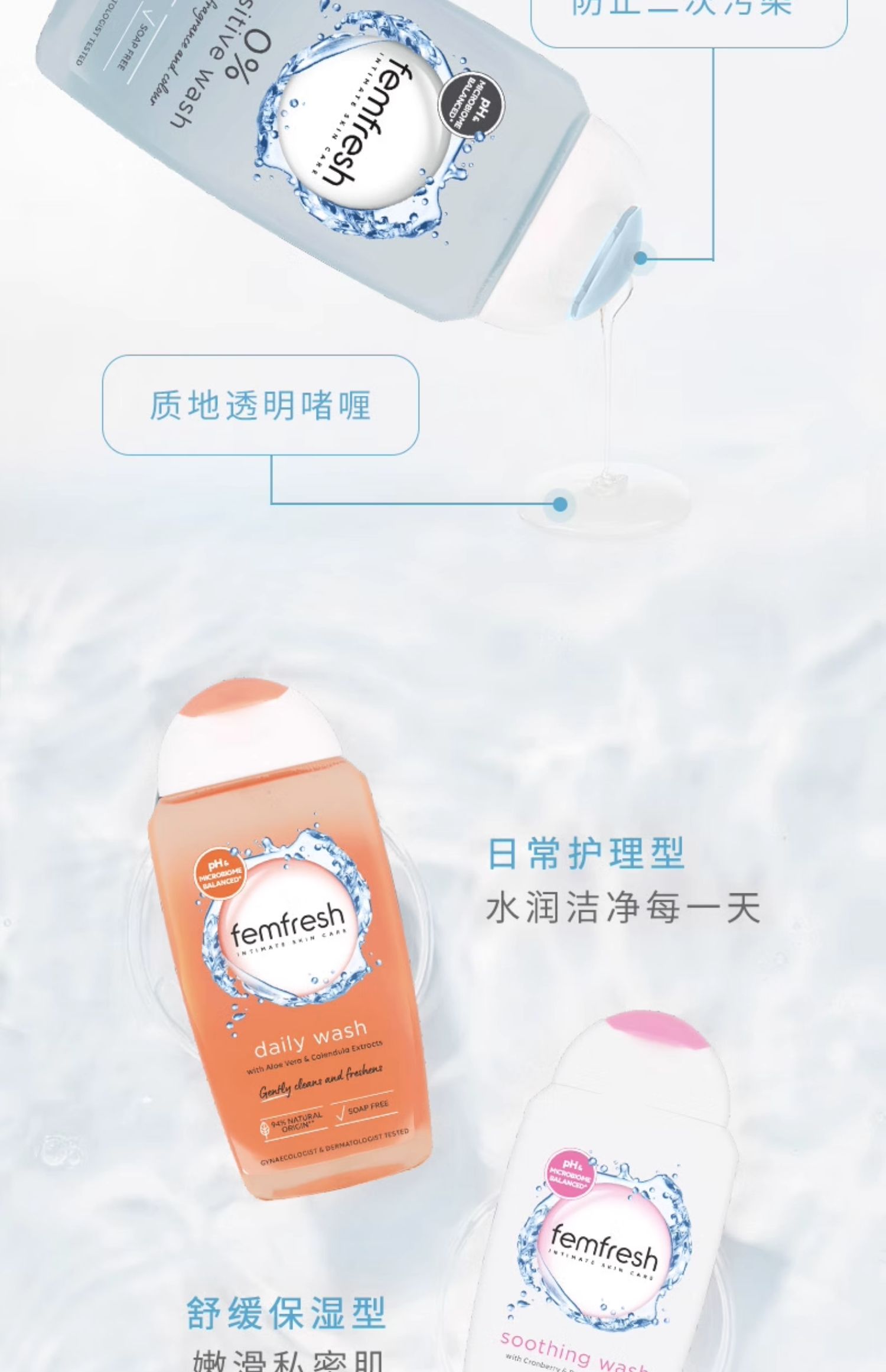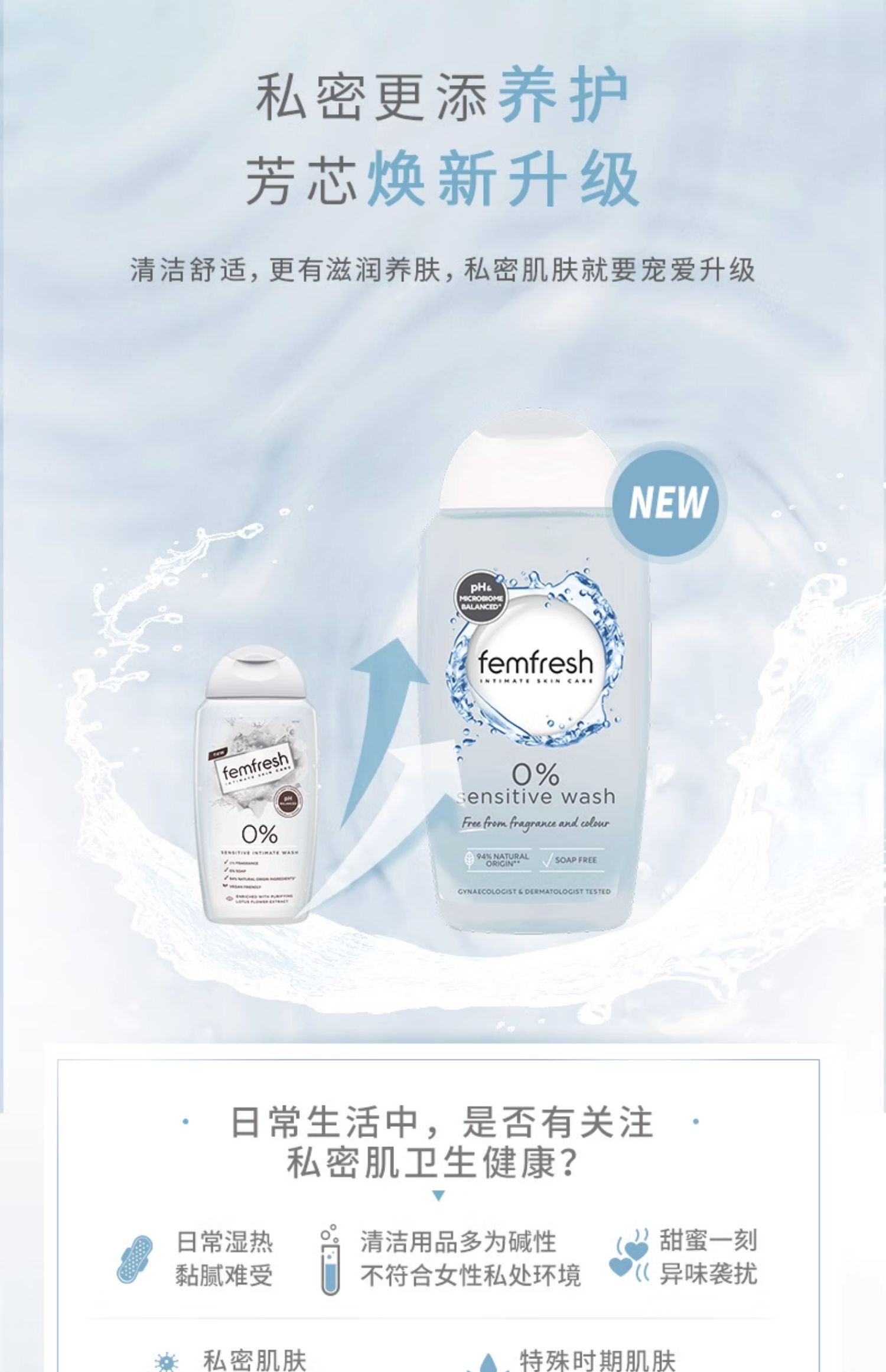 商品名称:英国芳芯femfresh女性私处清洁洗护亲肤特护经期护理敏感肌无香型