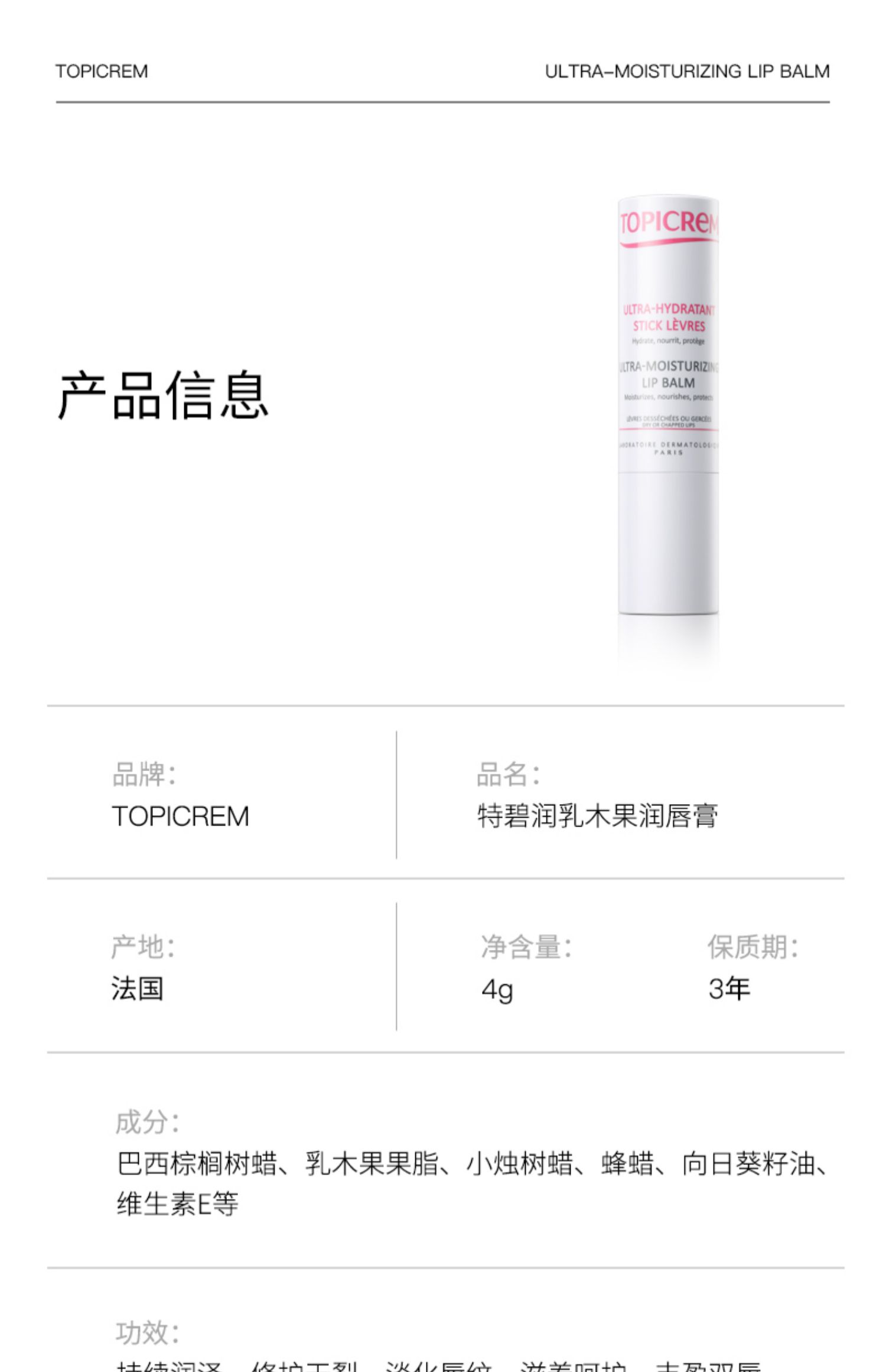 商品名称:Topicrem特碧润唇膏乳木果护唇膏女保湿滋润淡化唇纹补水防干裂男
