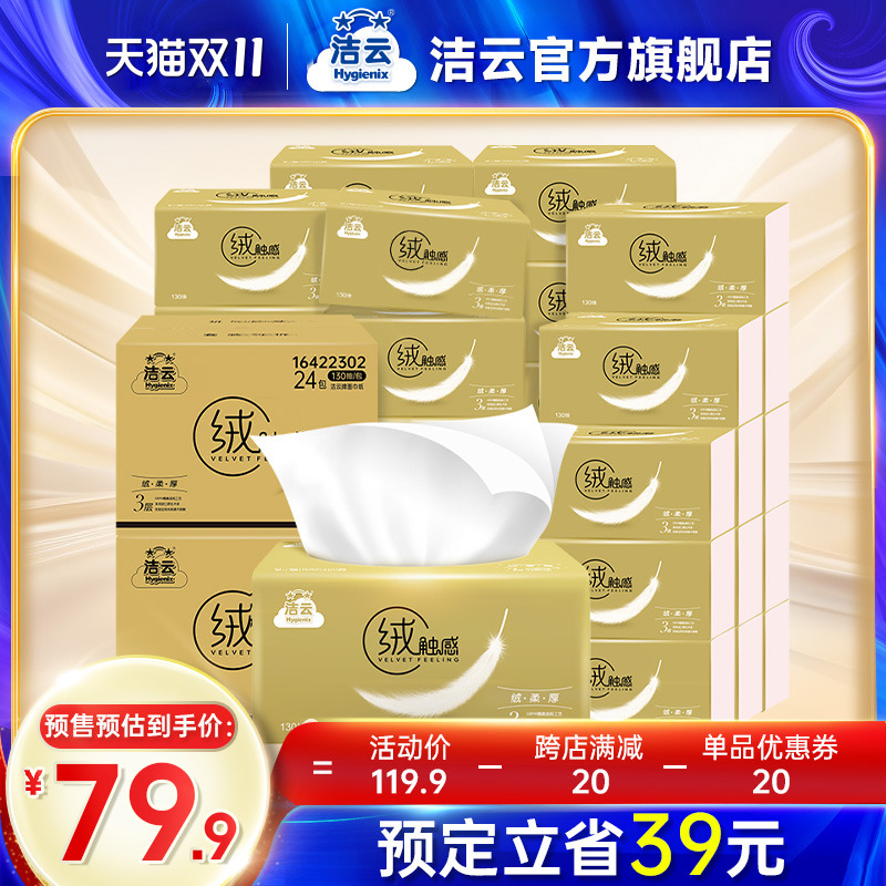 商品名称:洁云金装抽纸绒触感3层130抽48包抽纸家用实惠装亲肤纸巾整箱囤货