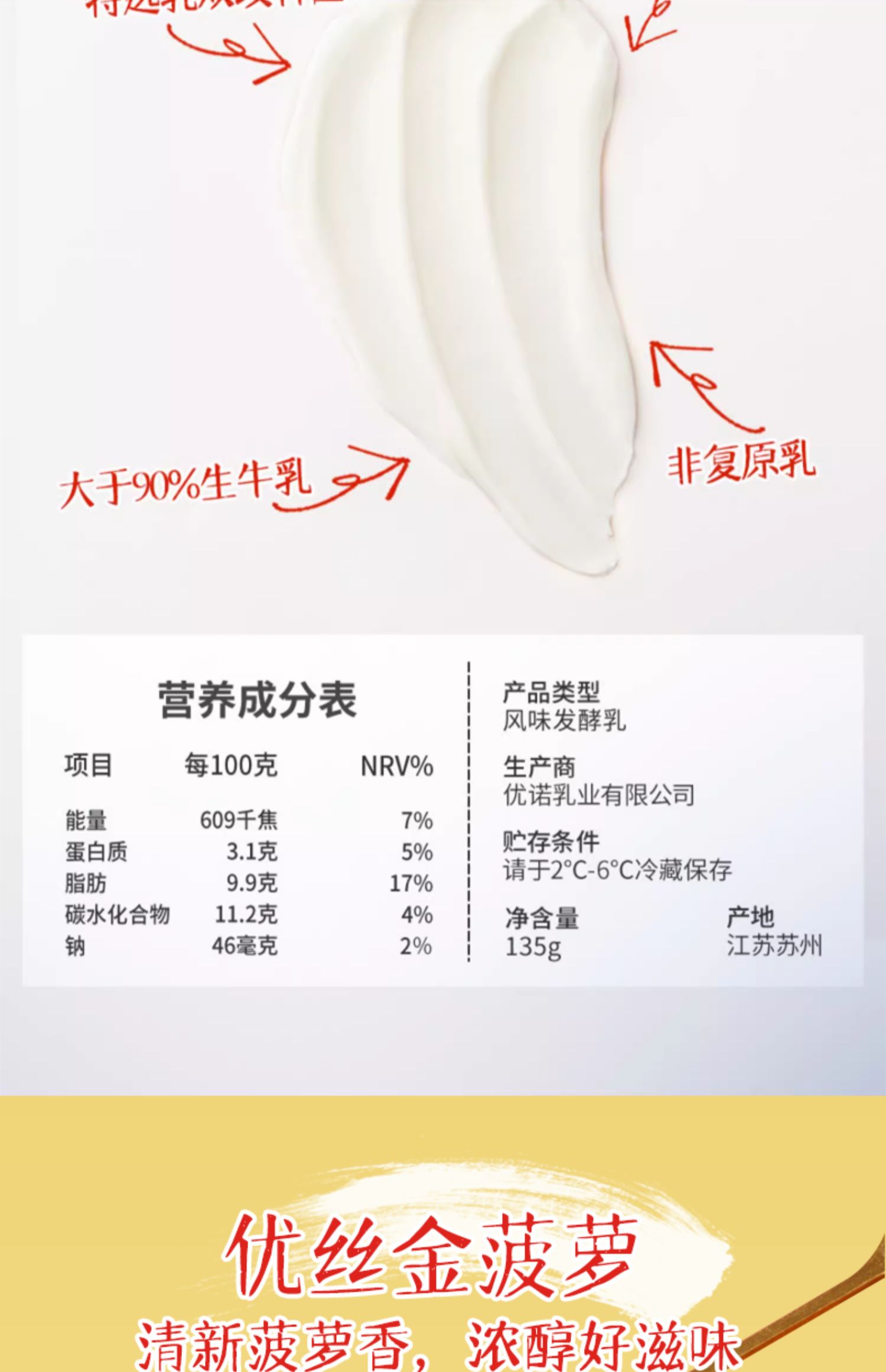 商品简介:【原价99-20元店铺立减)】【商超同款8.5元一杯】【顺丰冷链】一杯优诺酸奶≈2.5杯生牛乳!优选限定牧场生牛乳,11小时法式慢发酵,特添加益生菌,绵密丝滑,奶香浓郁。不含明胶和人工色素,层层检测,打造高品质酸奶!