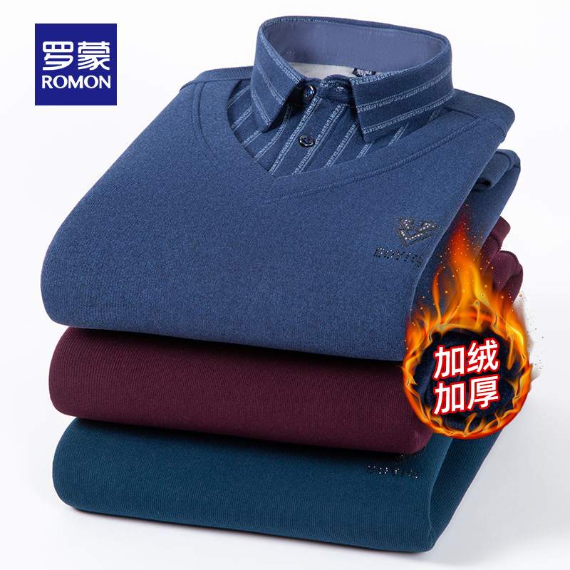 商品名称:【含羊毛加绒加厚】罗蒙男士翻领针织衫2024冬季假两件衬衫领毛衣
