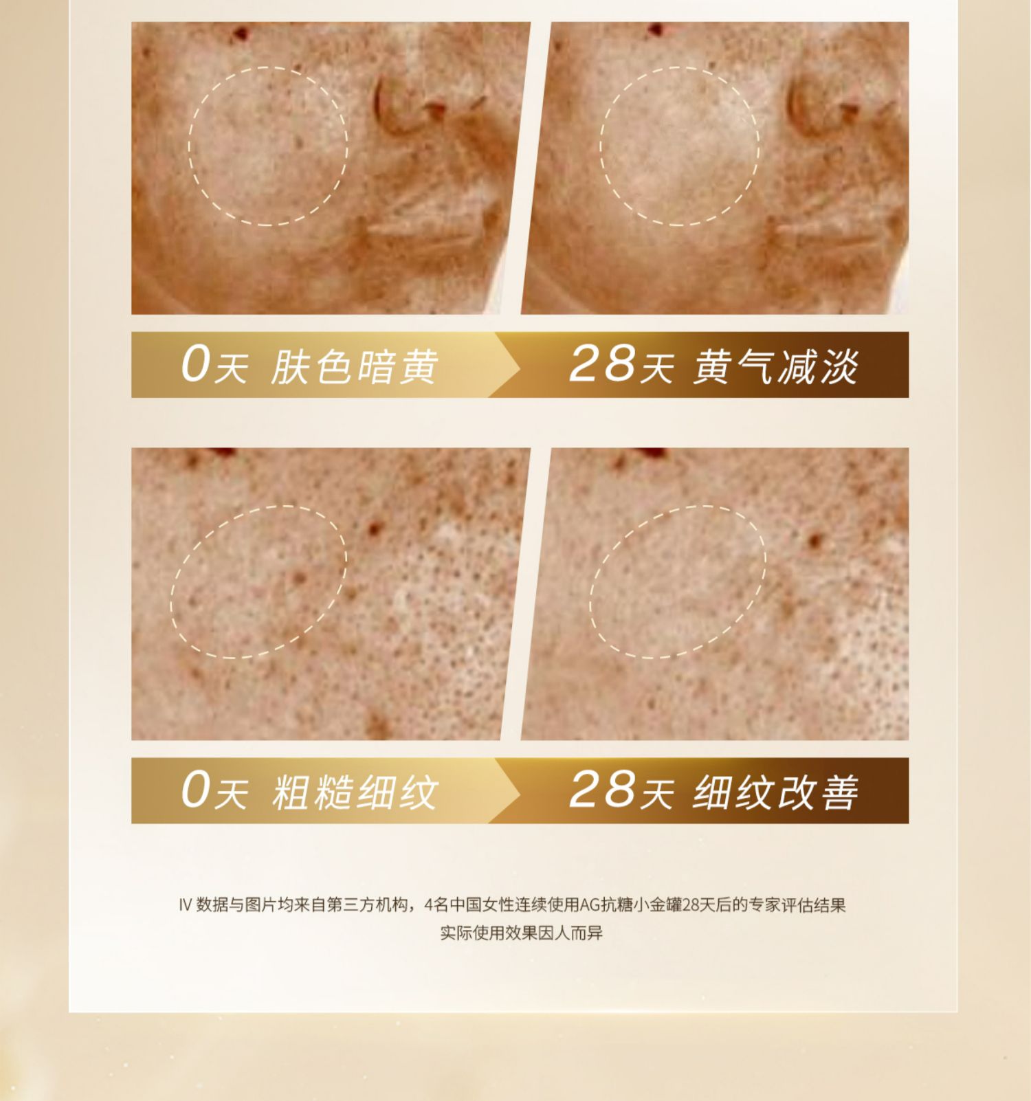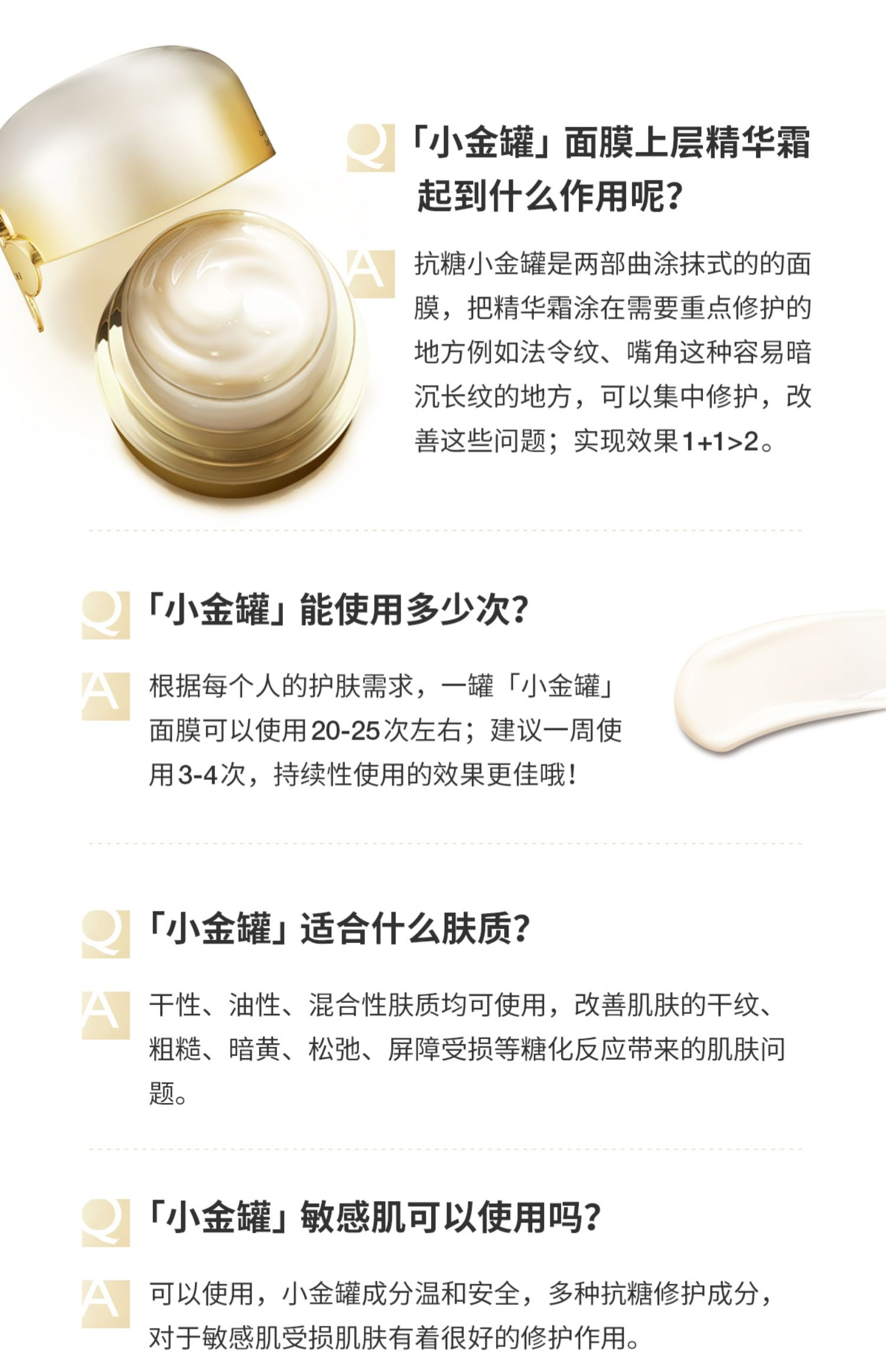 商品简介:【限时加赠】下单赠2.0小金罐(3g+15g)*3+金色水30ml*1!≈1/2正装量!先霜后膜,唤醒肌肤活力,深层抗糖有效修复肌肤!抗糖祛黄用这款!超赞~