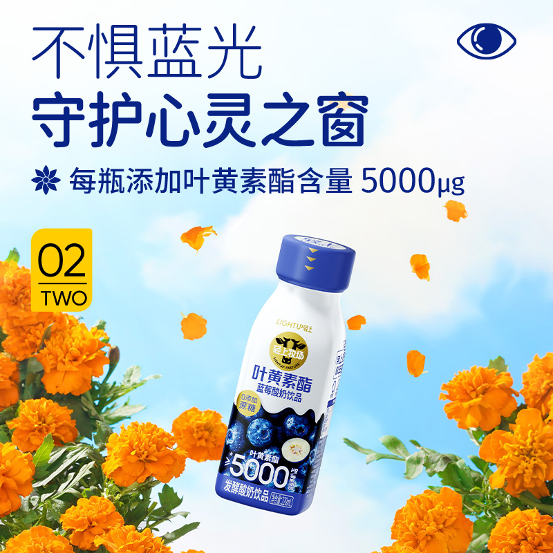 商品简介:轻上叶黄素酯蓝莓酸奶饮品整箱10瓶装,平均一瓶3.9元,1瓶约等于45颗蓝莓,不惧蓝光,进口澳洲生牛乳,新西兰乳粉两大丹麦乳酸菌深度发酵,0添加简0配方,轻松亮眼,官方旗舰店正品早餐奶!
