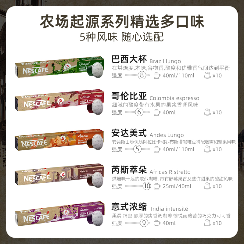 商品简介:【国际自营券满300减50,88VIP再享95折,到手更优惠~】新品瑞士进口雀巢nespresso胶囊咖啡粉农场系列意式黑咖