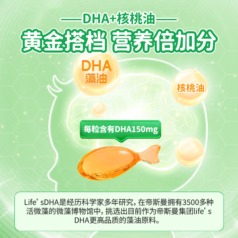 商品简介:【淘金币抵扣3.87起】高品质藻油DHA抓住孩子大脑黄金期,每粒含有DHA150mg,全封闭环境原藻种提炼特别添加核桃油,双油配方同步注入眼脑营养【赠运费险】