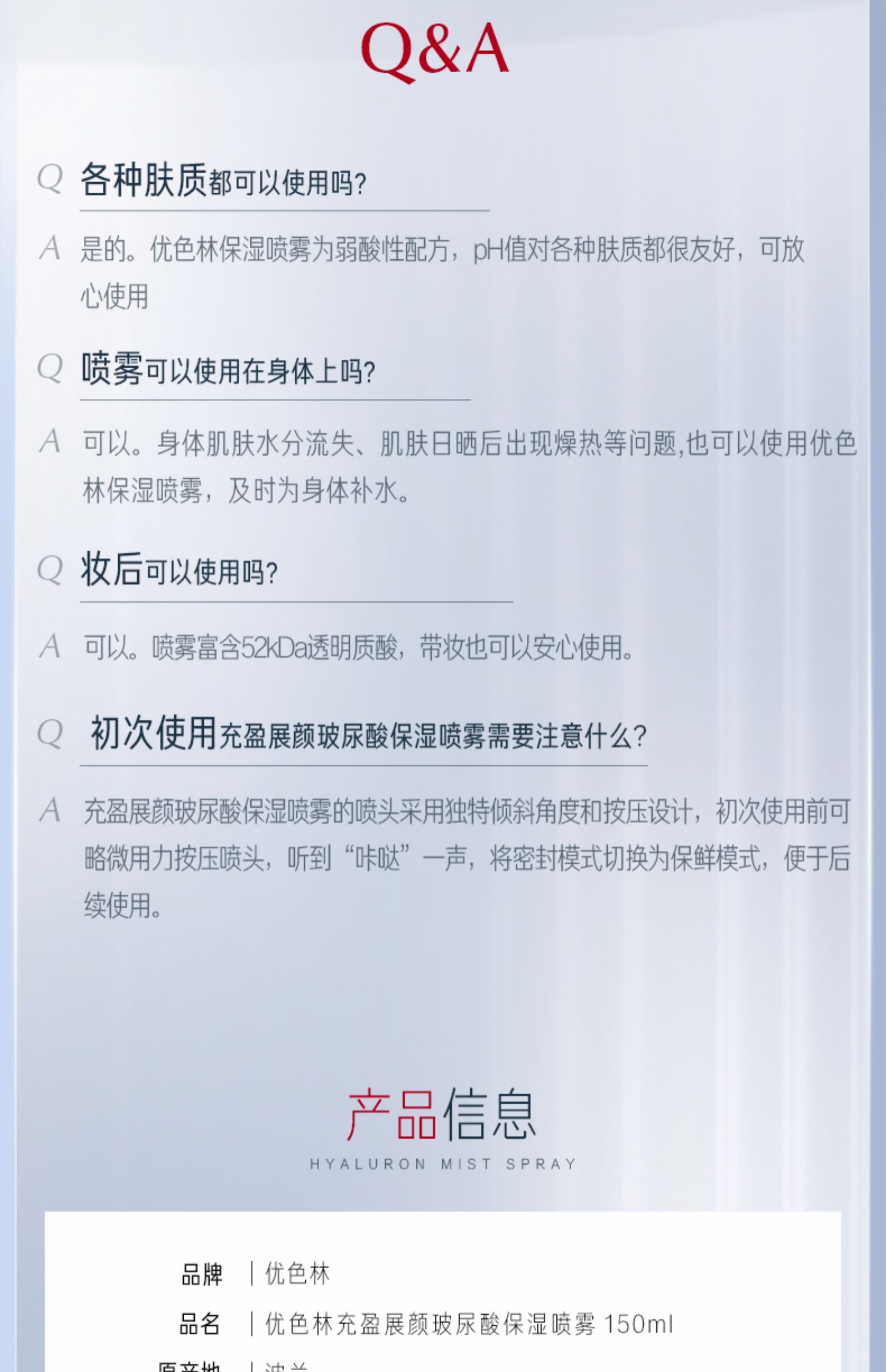 商品介绍:优色林补水保湿喷雾150ml*2爽肤水