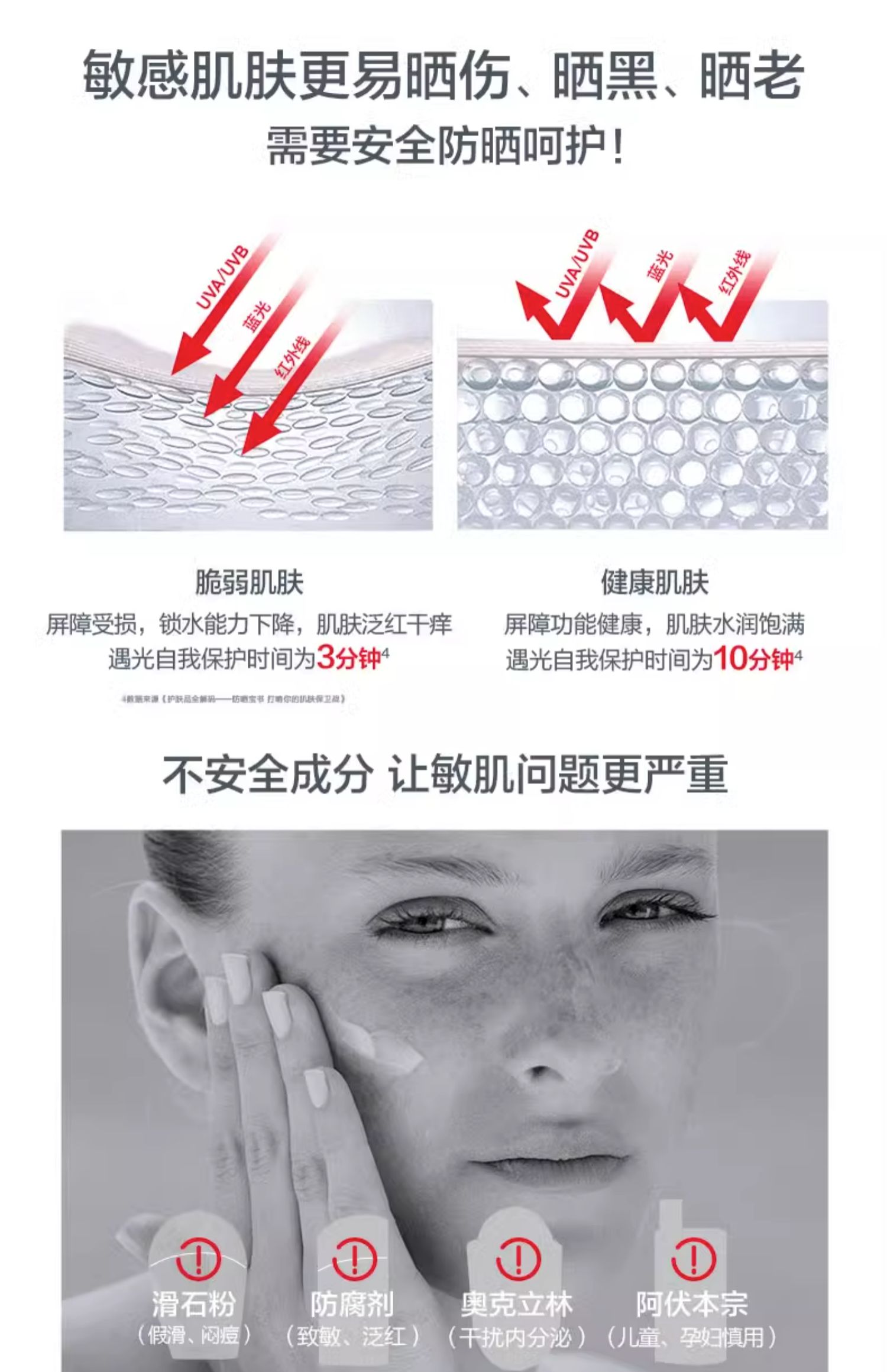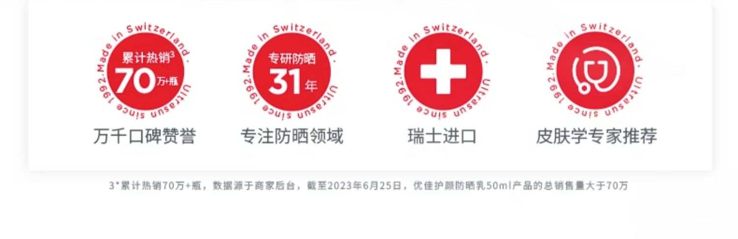 商品简介:优佳瑞士专业防晒品牌,30年专研敏感肌适用防晒!一瓶搞定夏季防晒!抵御光老化