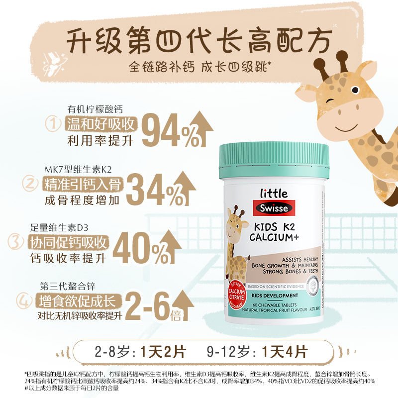 商品介绍:Swisse斯维诗儿童钙片K2柠檬酸钙60粒
