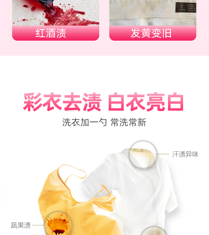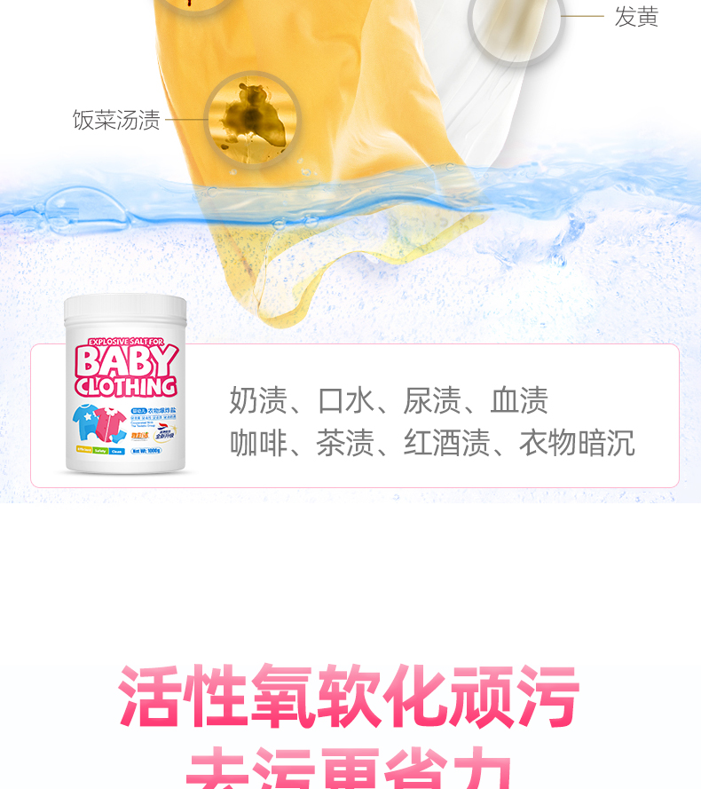 商品简介:超强大的去黄增白神器~宝妈快囤,雅彩洁婴幼儿爆炸盐!母婴适用!温和不伤手~黄渍,奶渍,污渍通通轻松除!