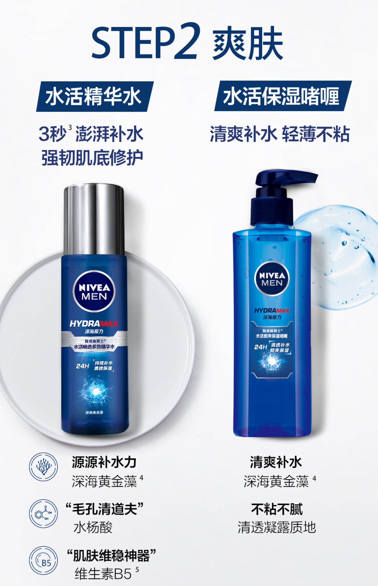商品简介:【双十一满300-50到手价162.5】【新爱心礼盒;水活洁面50g+水活畅透精华水50ml+水活畅透精华露10ml+水活面膜加赠皇马球衣帆布袋,限量3K,续航赠情侣卡牌(NIVEA2109),限量3K】爆水保湿三件套,净撤补水,肌肤润泽透亮,专为男士肌肤定制,轻松改善干燥难题。