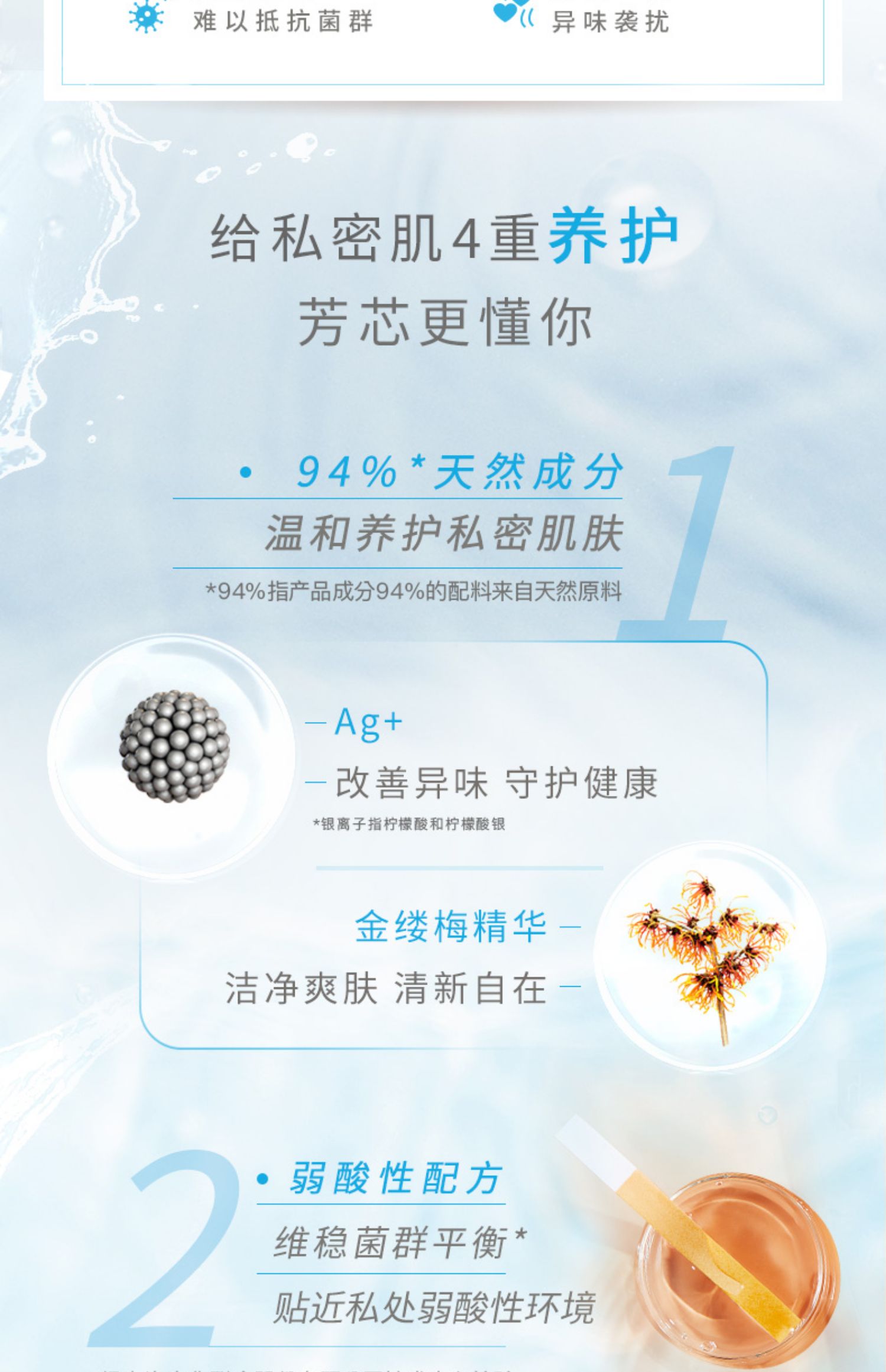 商品简介:英国芳芯,清洁滋润双效合一,改善异味,守护健康,维护菌群平衡,英国原装进口,呵护更贴心,保持健康与自信,从呵护私密开始——Femfresh守护你的清新!轻松清洁,不再尴尬。Femfresh助你找回自然的味道!