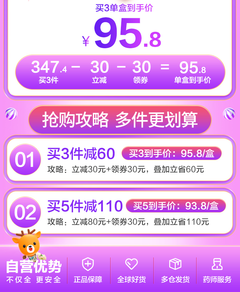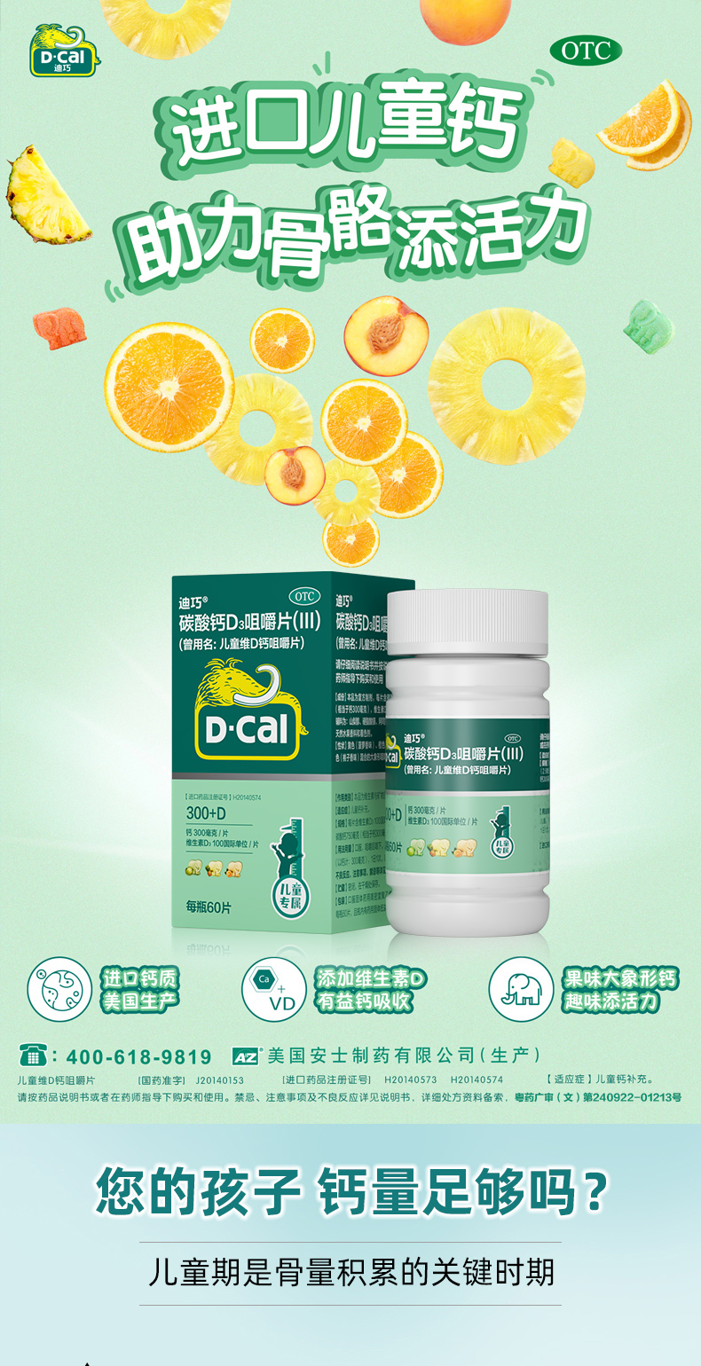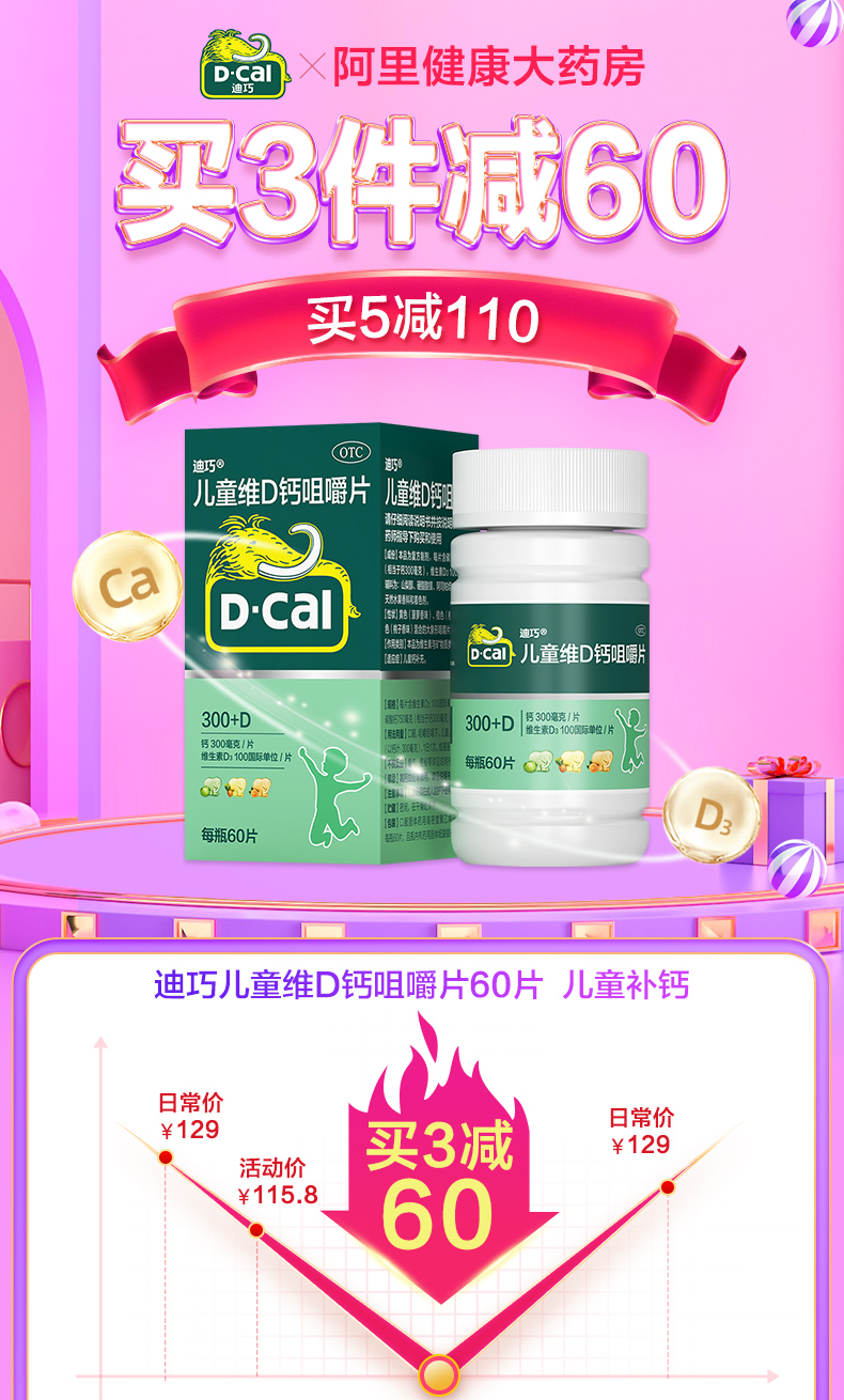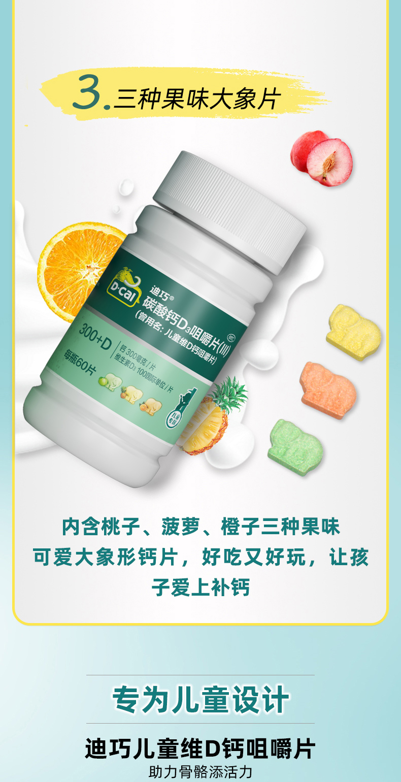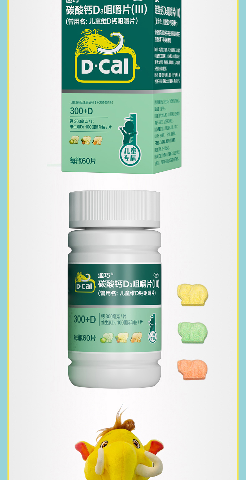 商品简介:拍二券后149.6凑单125.44,迪巧儿童维D钙咀嚼片,美国进口,科学配方,营养全面,含钙充足,补钙易吸收,好吃好玩,大象外型3种果味,满足宝宝成长所需,让宝宝身体棒!