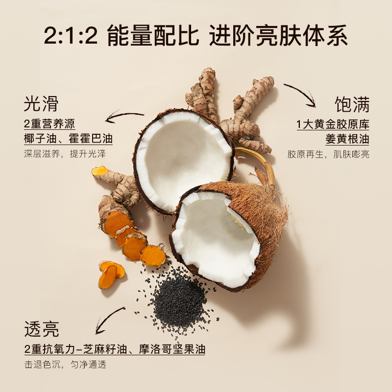 商品简介:它的味道超级治愈,椰香混合着姜黄的温暖,仿佛置身于热带岛屿。质地轻薄不油腻,一抹即化,吸收超快!用了几天后,感觉皮肤明显提亮了一个度,抗氧化效果杠杠的!保湿效果也很赞,干燥肌的姐妹们放心冲!