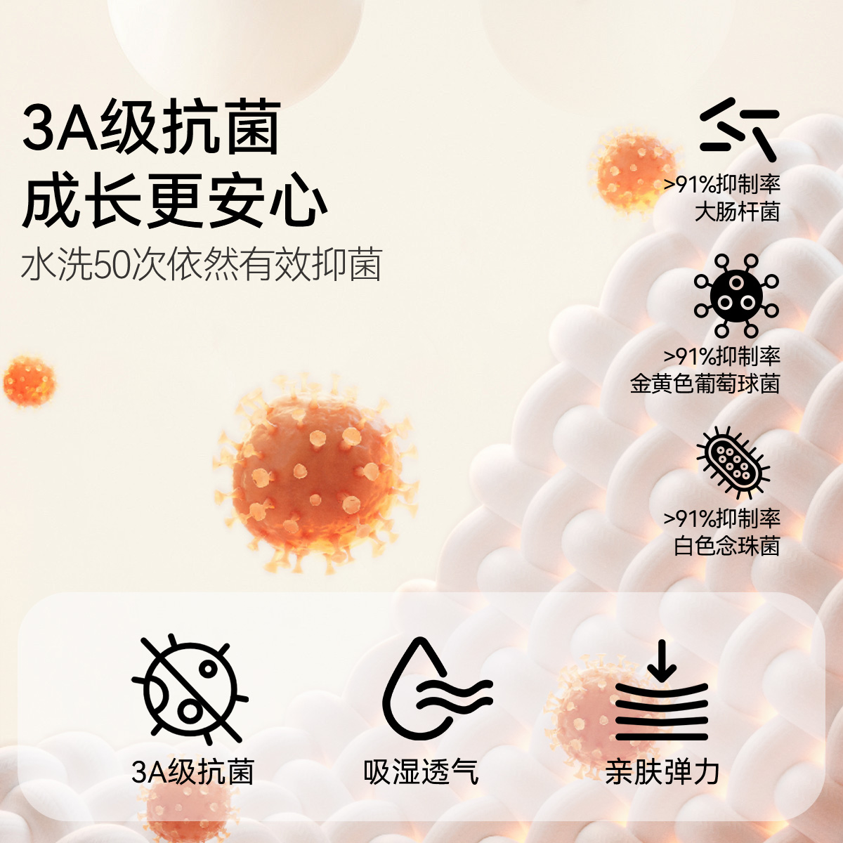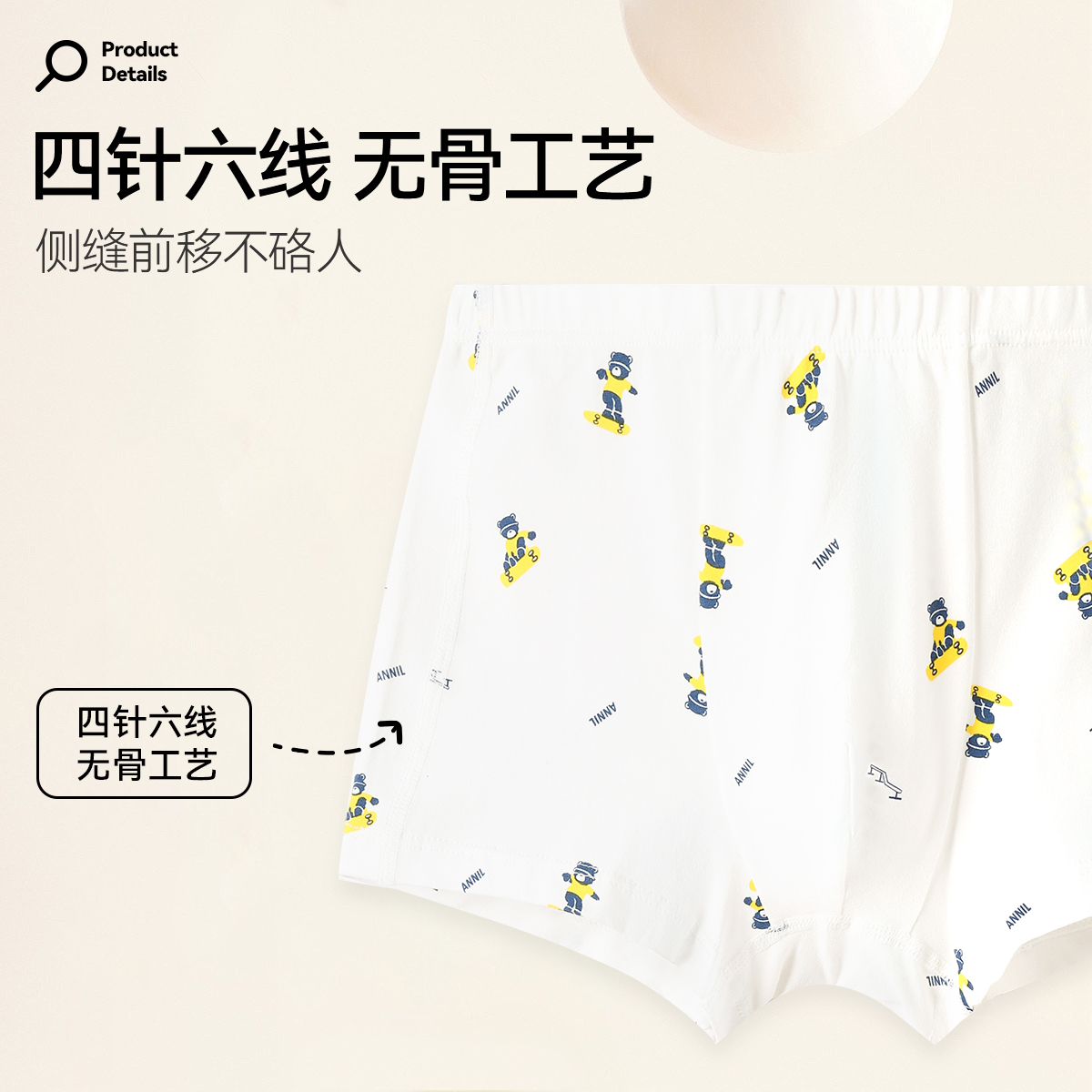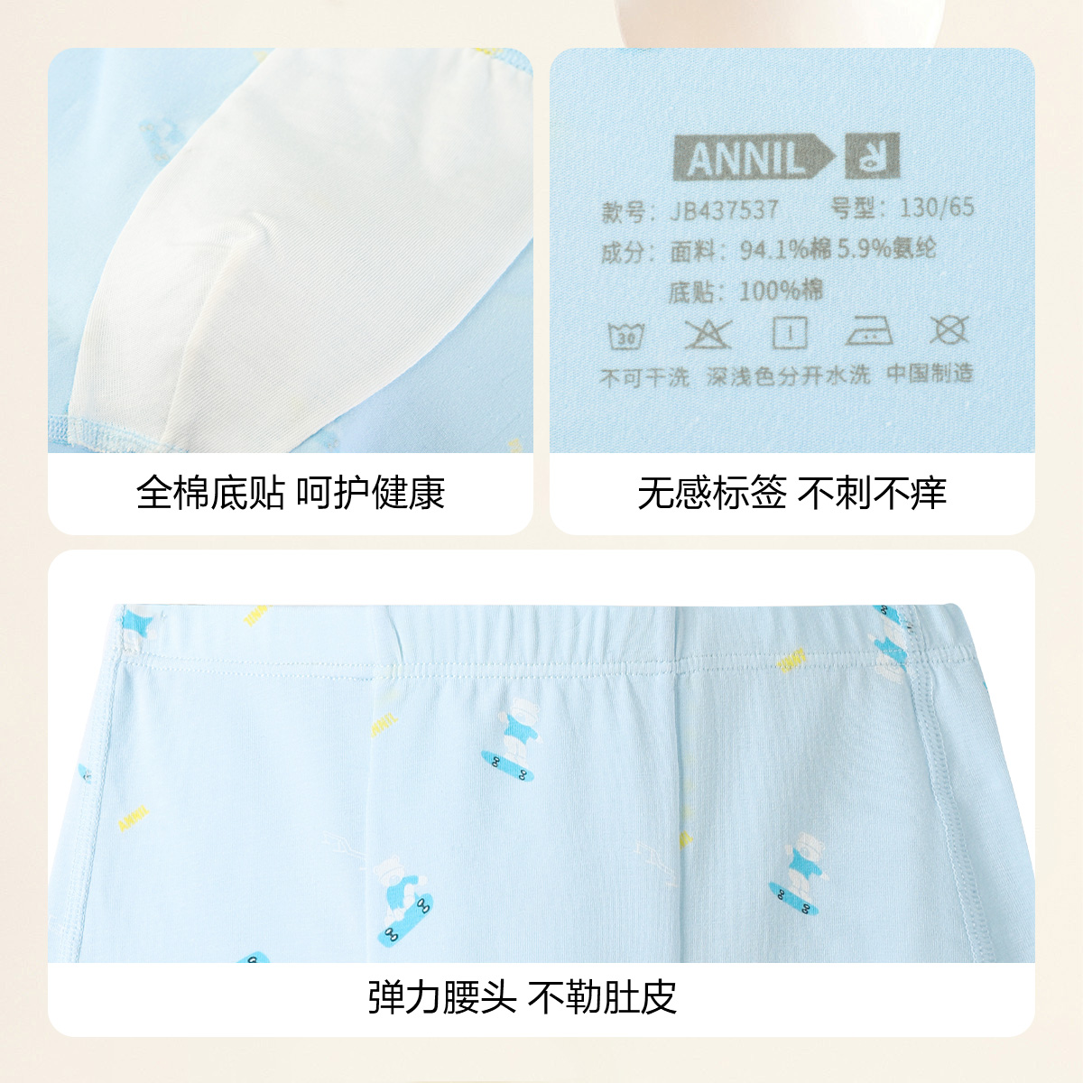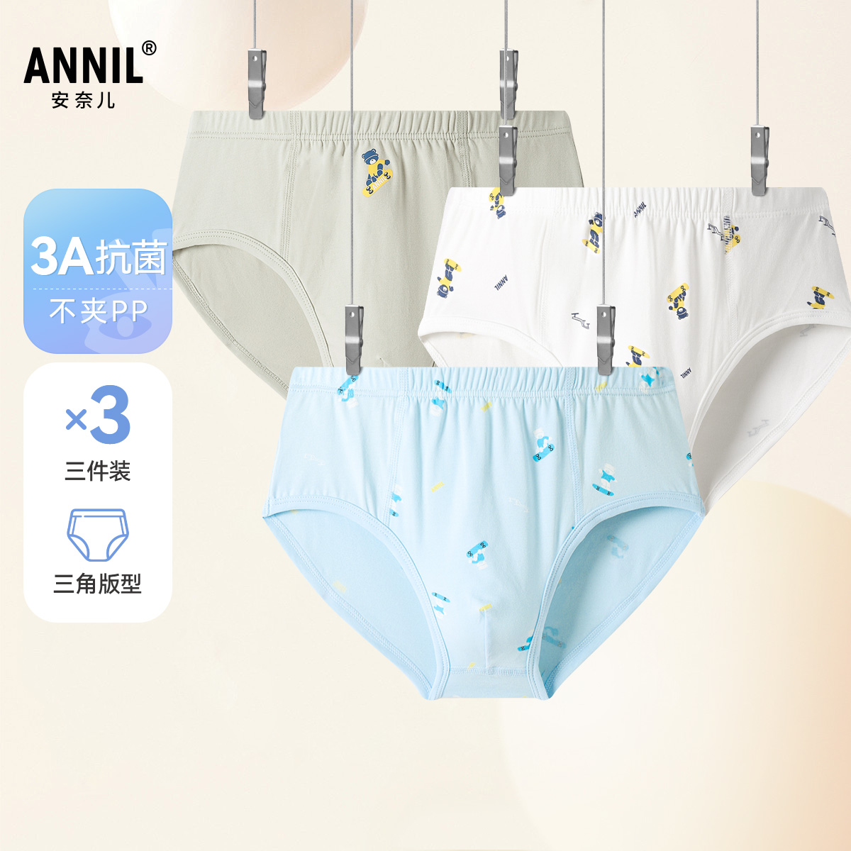 商品简介:抗菌内裤,贴身呵护,平角版型三件装,3A级抗菌成长更安心,U型太空舱呵护成长。