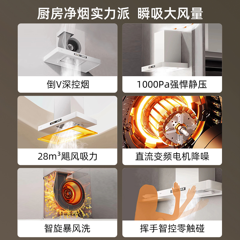 商品简介:【赠华帝电煮锅】口碑尖货,到店必囤!极简T型烟机精致设计时尚百搭!倒V深控烟!瞬捷围捕防逃窜!超强负压,四面环吸,紧锁油烟防扩散,油烟不扑脸
