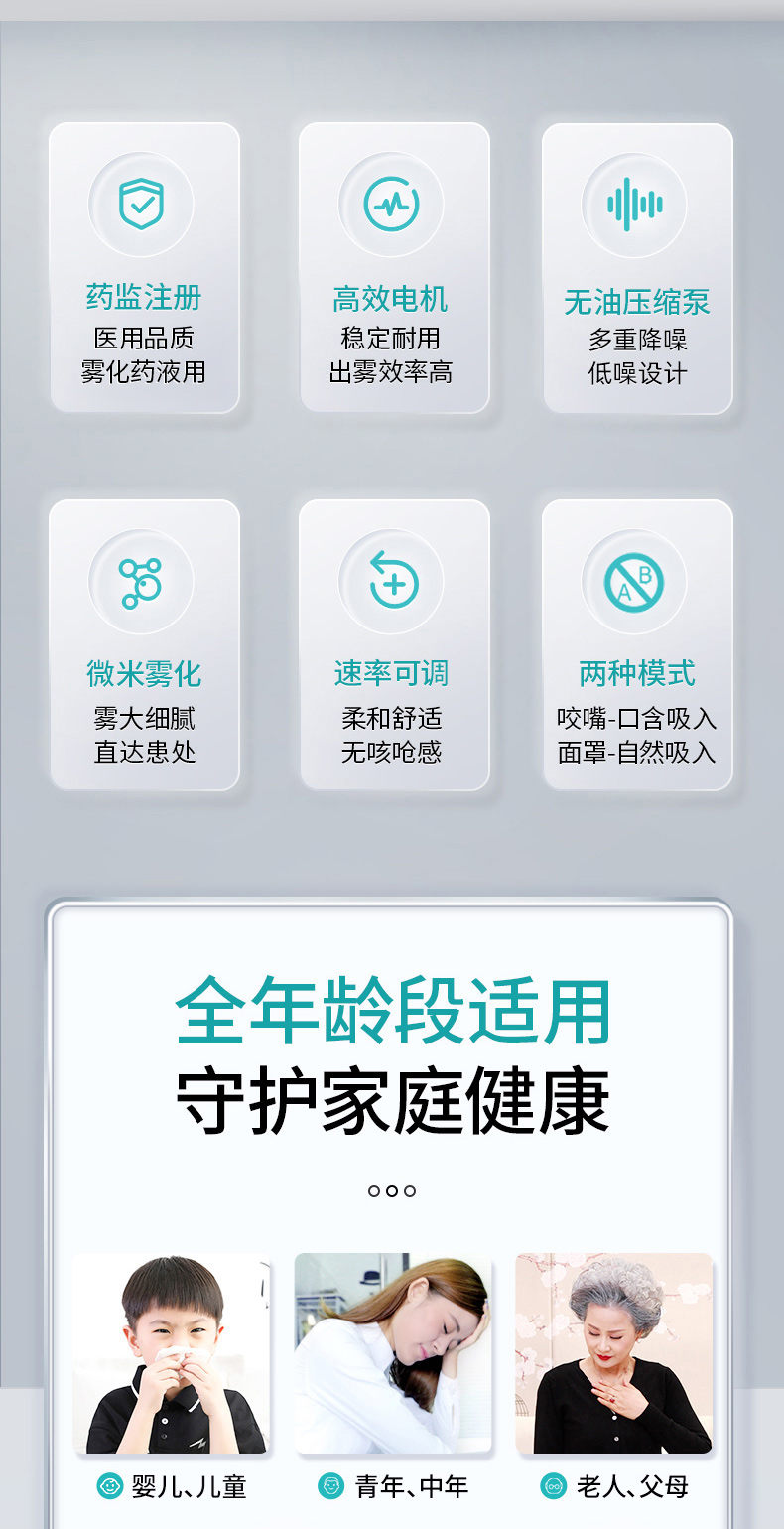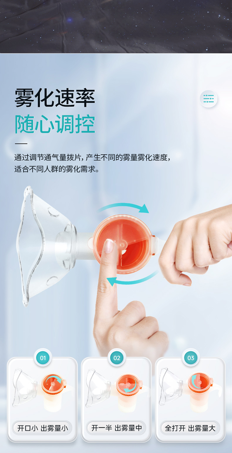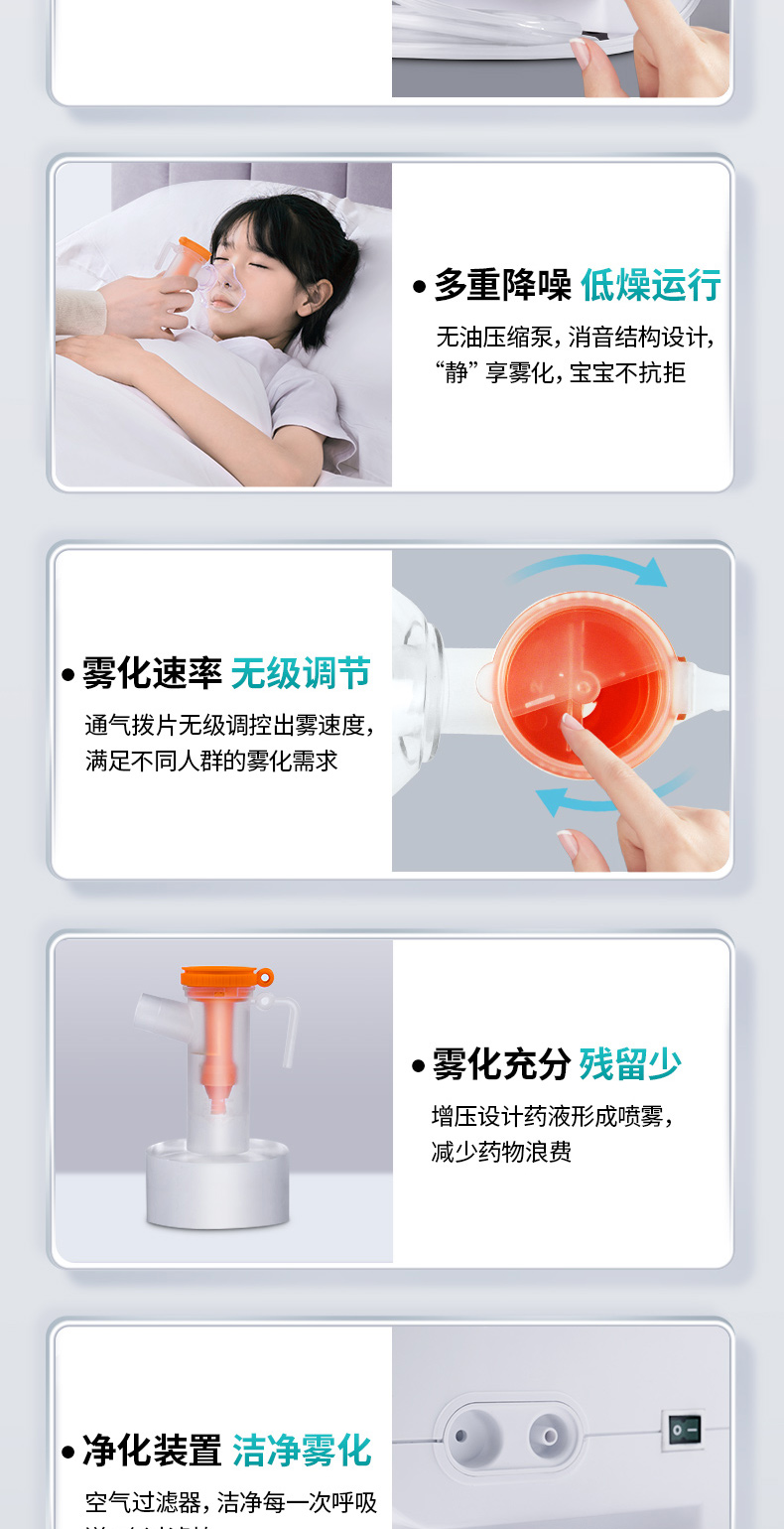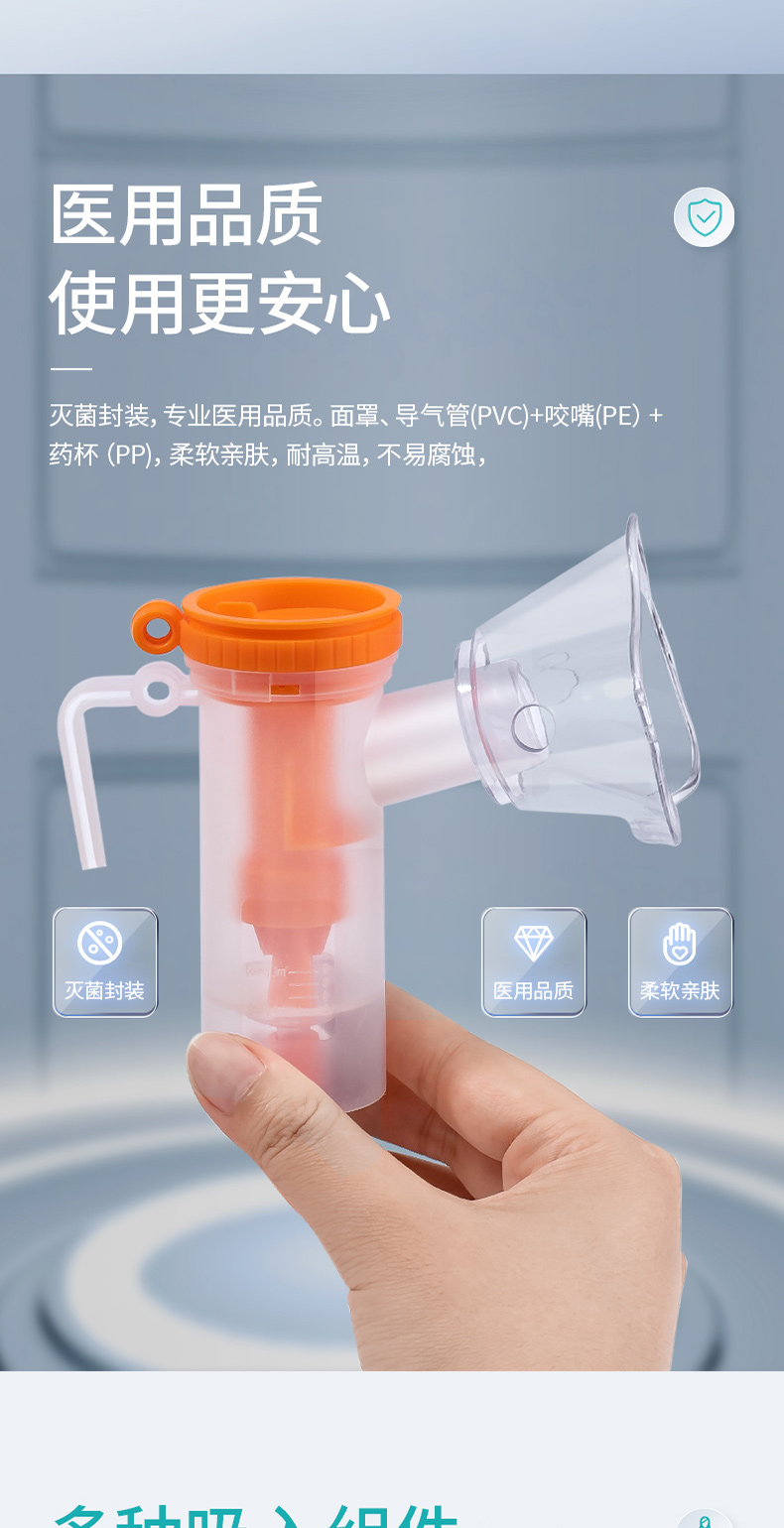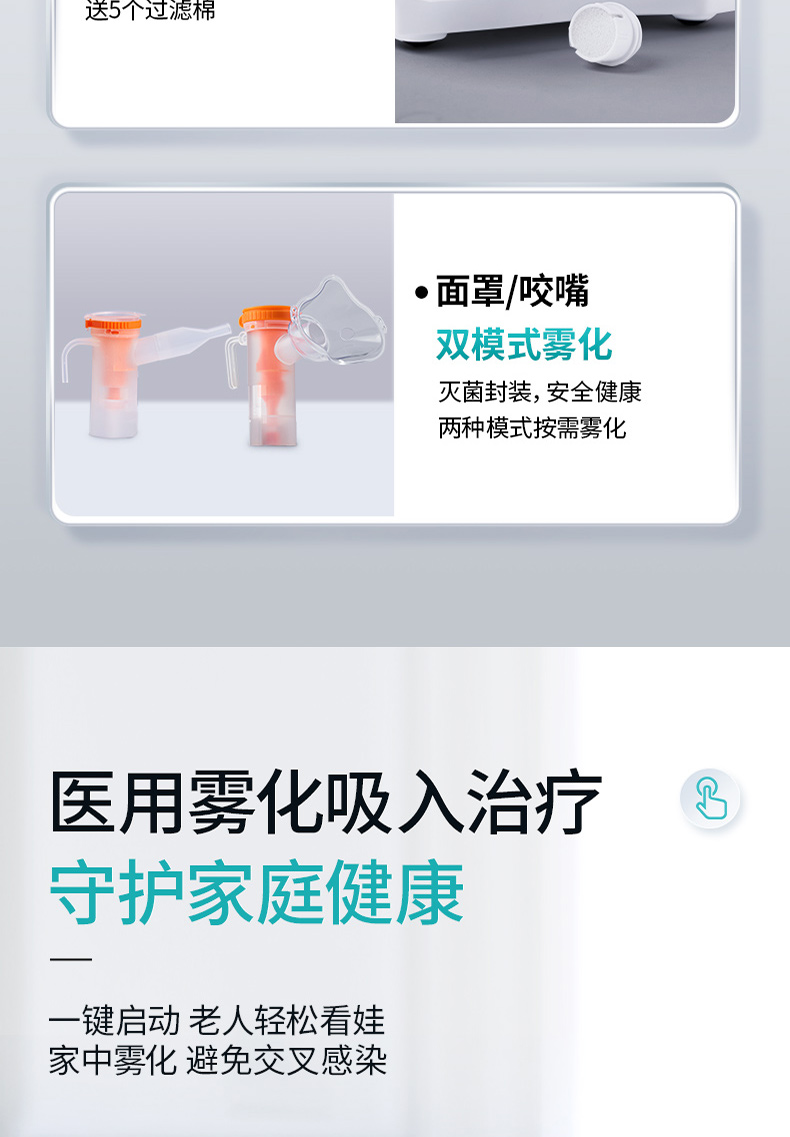 商品简介:医用家用化痰止咳,咬嘴/面罩双模式,低噪设计,出雾量大,低噪舒适,呼吸自然雾化颗粒细腻,医用材质安心使用!微米雾化,好吸收不呛喉,动力强劲,出雾快效率高,全年龄段适用,守护家庭健康!