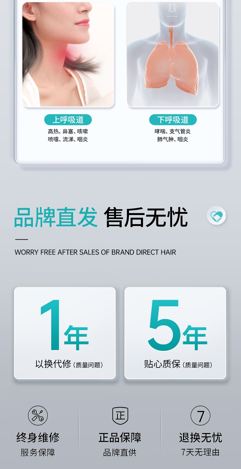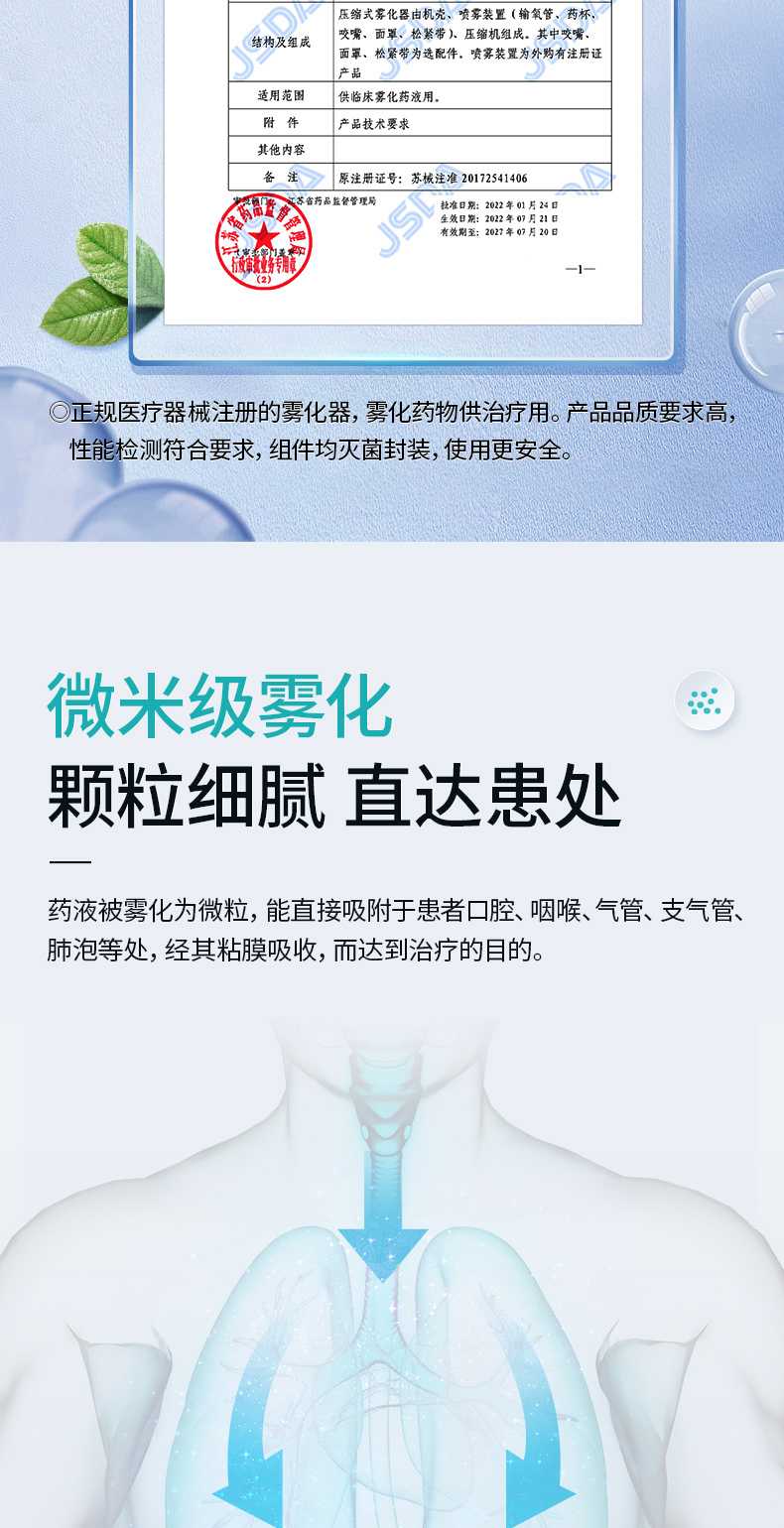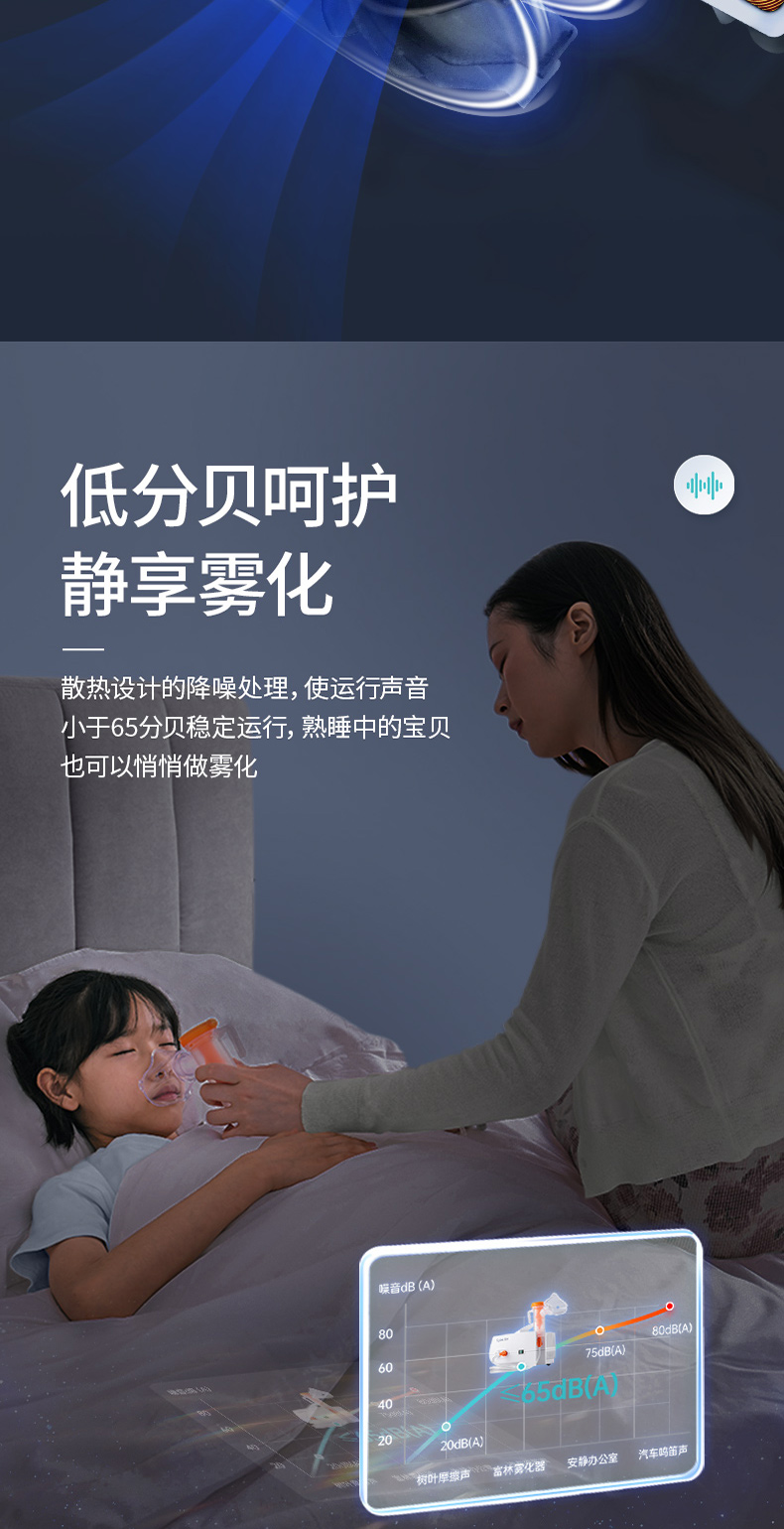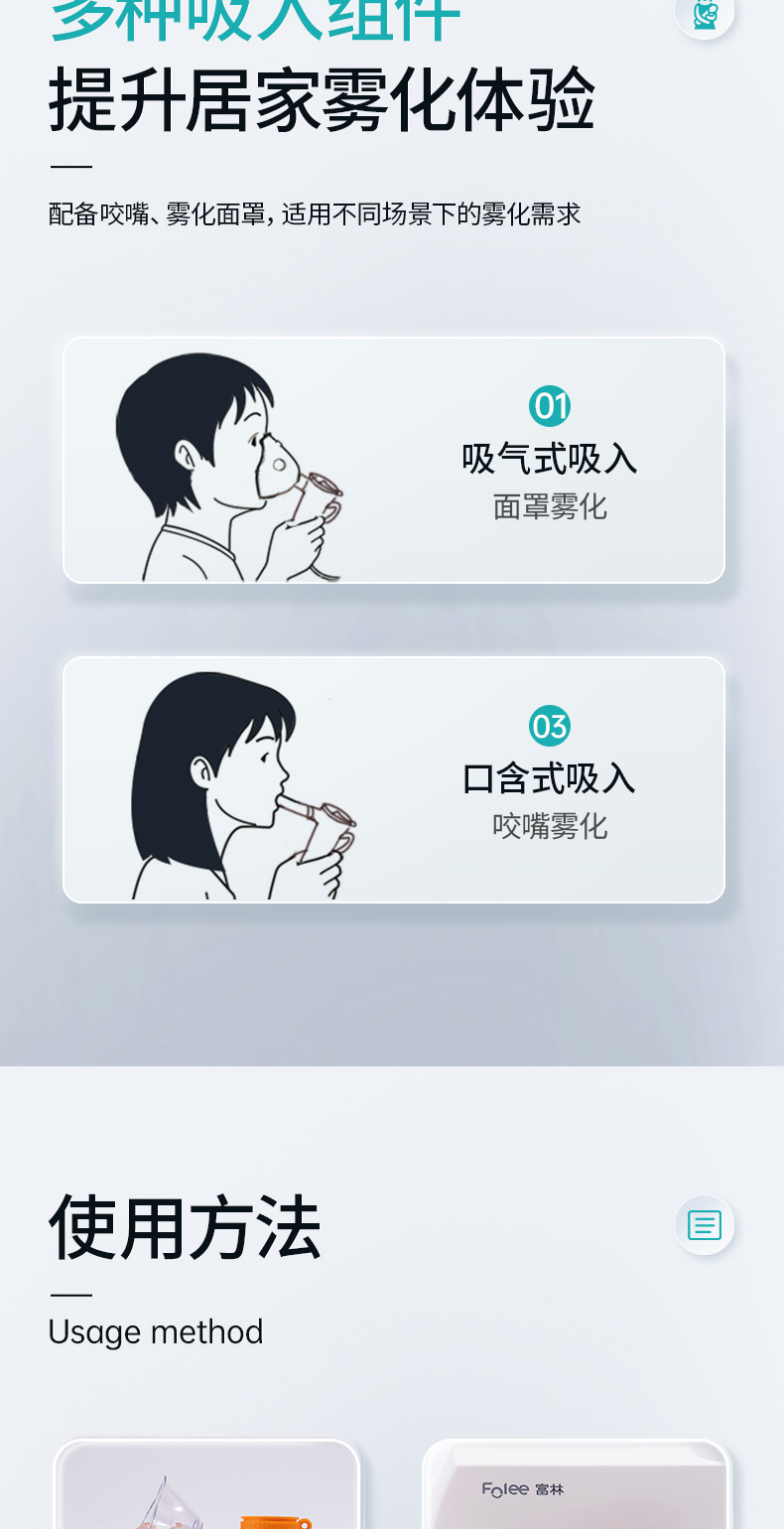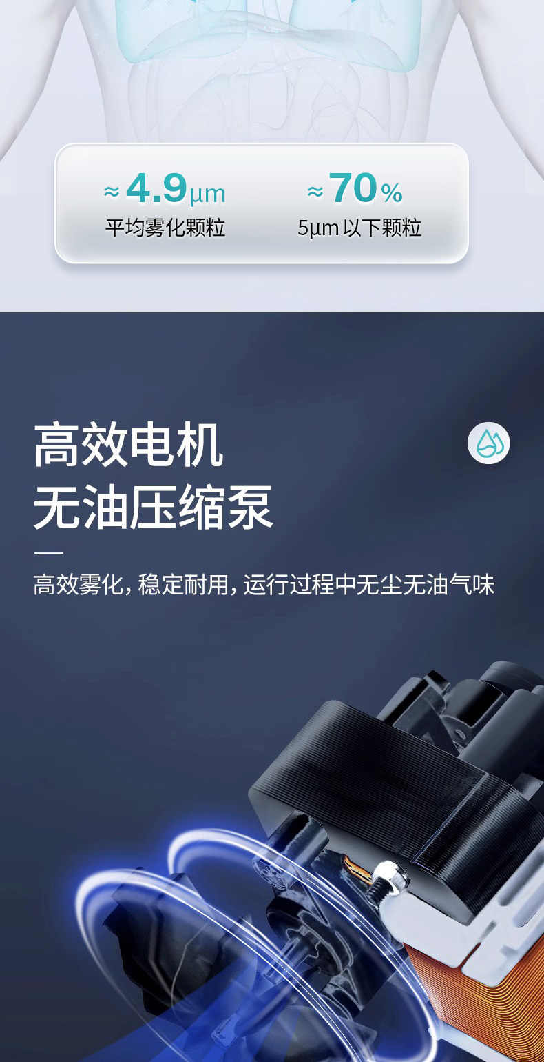 商品简介:医用家用化痰止咳,咬嘴/面罩双模式,低噪设计,出雾量大,低噪舒适,呼吸自然雾化颗粒细腻,医用材质安心使用!微米雾化,好吸收不呛喉,动力强劲,出雾快效率高,全年龄段适用,守护家庭健康!