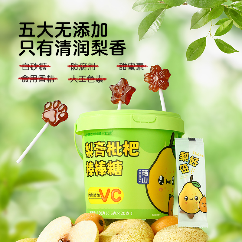 商品名称:赫尔仕康秋梨膏枇杷VC棒棒糖无添加宝宝健康零食儿童营养糖果桶装