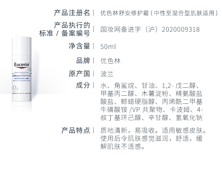 商品名称:优色林舒安霜中性50ml敏感肌修护肌肤屏障面霜保湿滋润乳液女