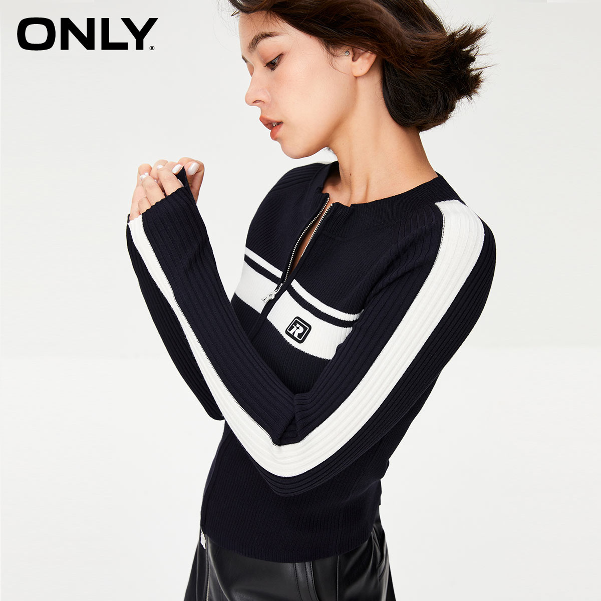 商品名称:ONLY秋季时尚撞色美式辣妹打底上衣百搭修身长袖插肩袖针织开衫女