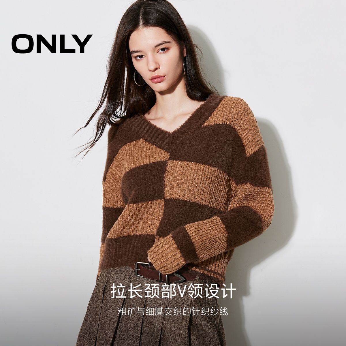 商品名称:ONLY2024冬季新款潮流撞色宽松显瘦V领长袖针织衫女|124413002