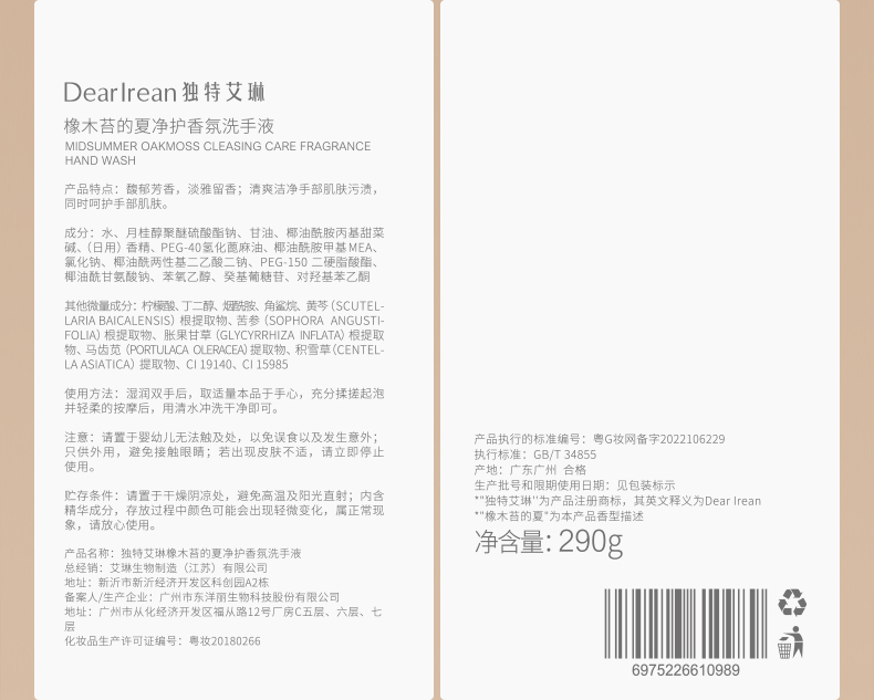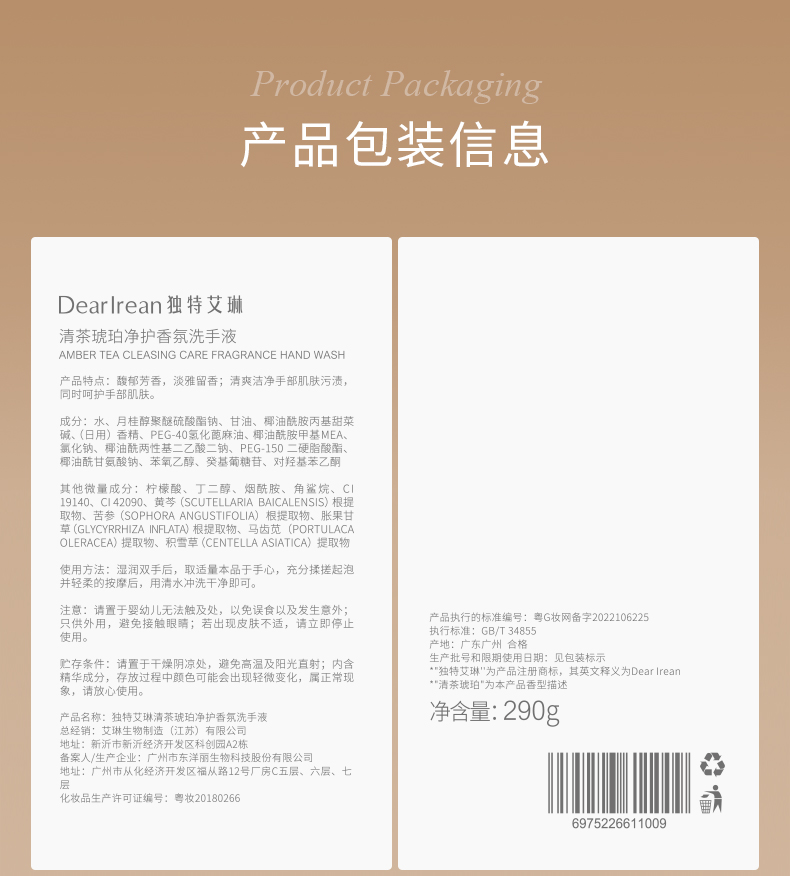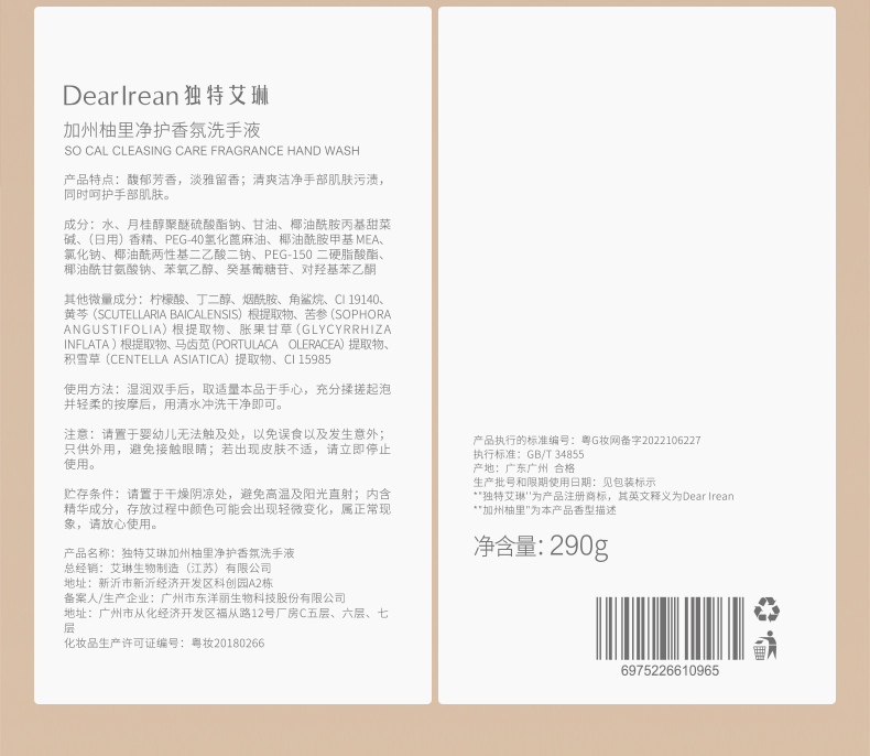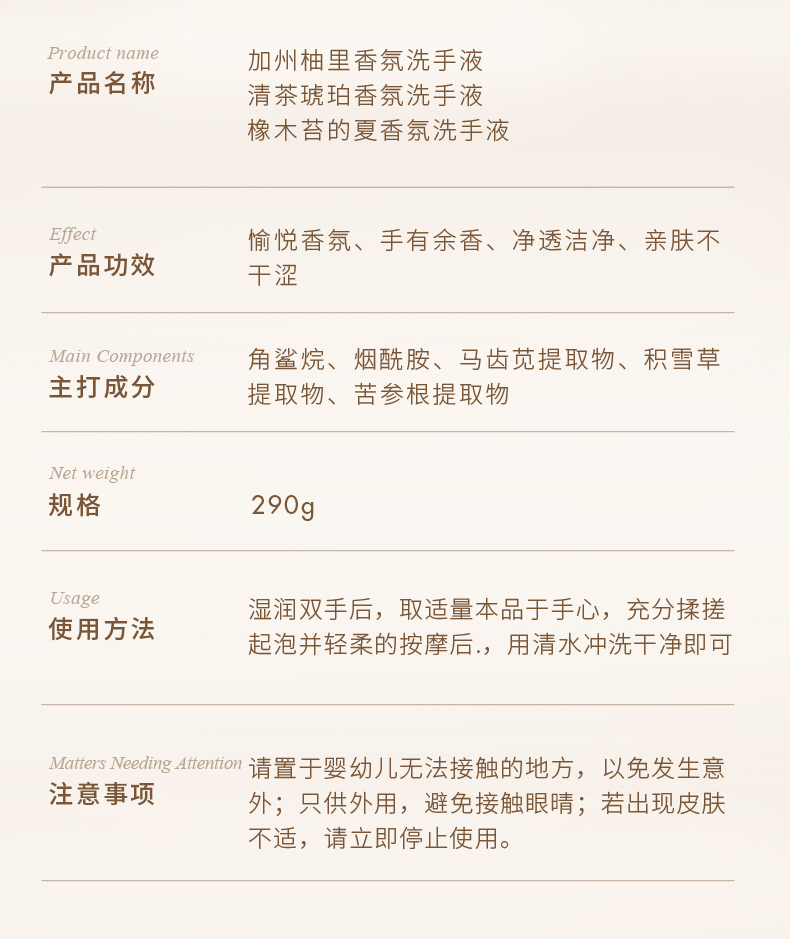商品介绍:独特艾琳香氛洗手液家用高级香家庭装290g