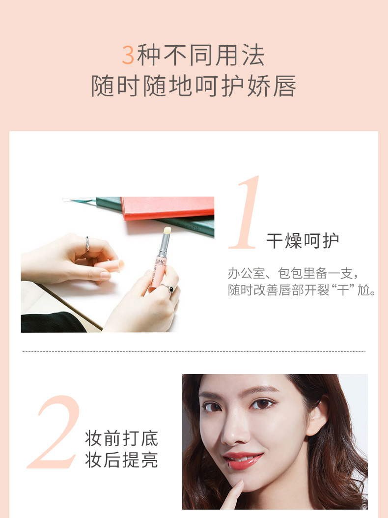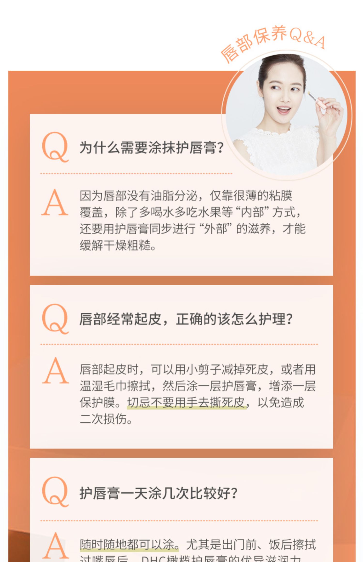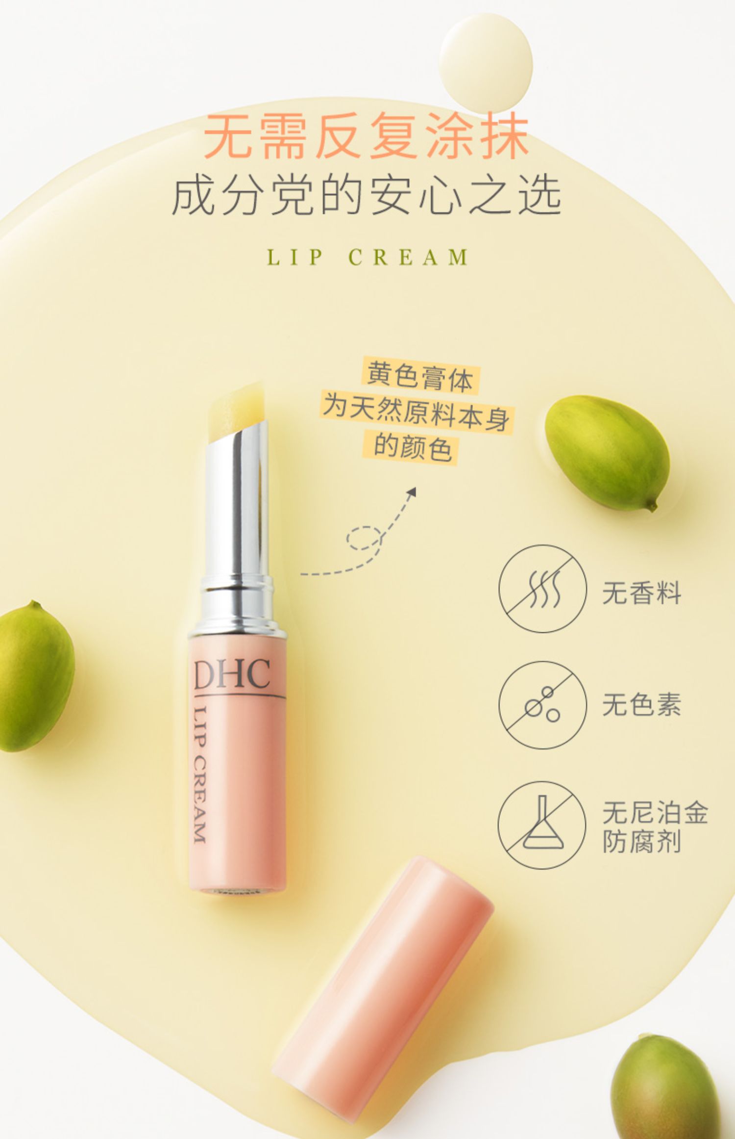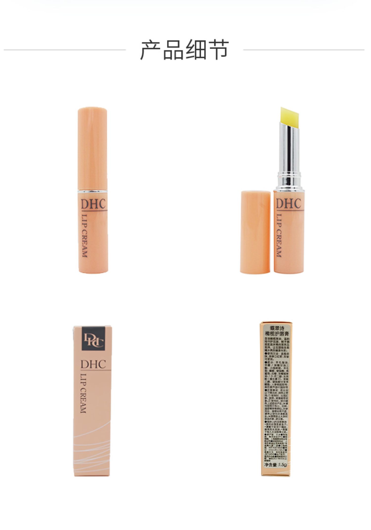 商品简介:DHC,中文译为蝶翠诗,是来自日本的著名药妆品牌,其卸妆、洁面产品颇受亚洲MM的推崇,这款同样是COSME大赏产品,这款唇膏在秋冬换季绝对是必备品。黄色膏体有淡淡的橄榄味,涂在嘴唇上很滋润却不油腻,还有淡化唇纹的功效。白天涂抹可以保证大半天不干不脱皮,经常涂口红的妹子也可以入一个做唇部打底,口红的显色度和滋润度会更好。