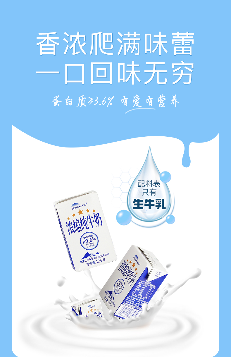 商品介绍:拍4件80盒天润新疆浓缩纯牛奶125g