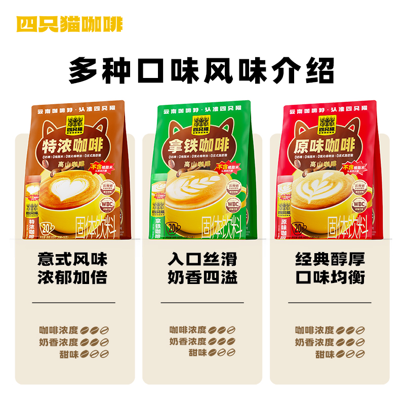 商品简介:0反式脂肪酸,好喝不怕胖!!!还有易撕口太方便了!!!打工人的日常离不开咖啡啊!!四只猫咖啡真囤货必备!!!爱喝咖啡的姐妹都给我无脑冲!!!减肥的朋友也能喝!!!